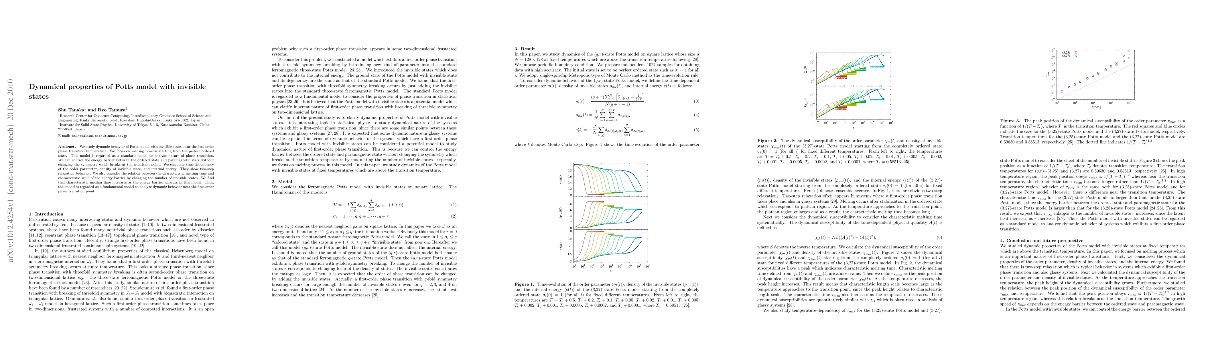 The research focuses on the dynamic behavior of the Potts model with invisible states near the first-order phase transition temperature, specifically analyzing the melting process starting from a perfectly ordered state. The study uses a (q, r)-state Potts model on a square lattice with periodic boundary conditions, employing a single-spin-flip Metropolis-type Monte Carlo method for time evolution.