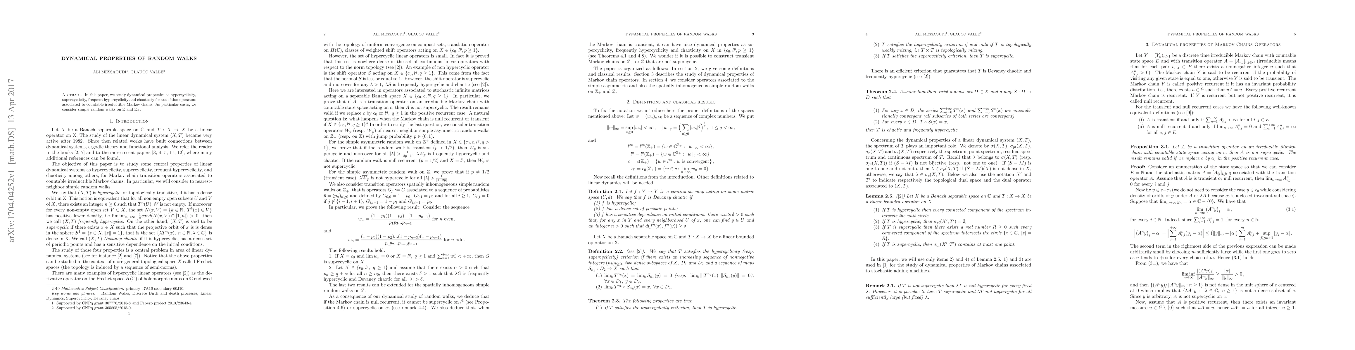 This paper investigates dynamical properties like hypercyclicity, supercyclicity, frequent hypercyclicity, and chaoticity in transition operators of countable irreducible Markov chains, with specific focus on simple random walks on Z and Z+.