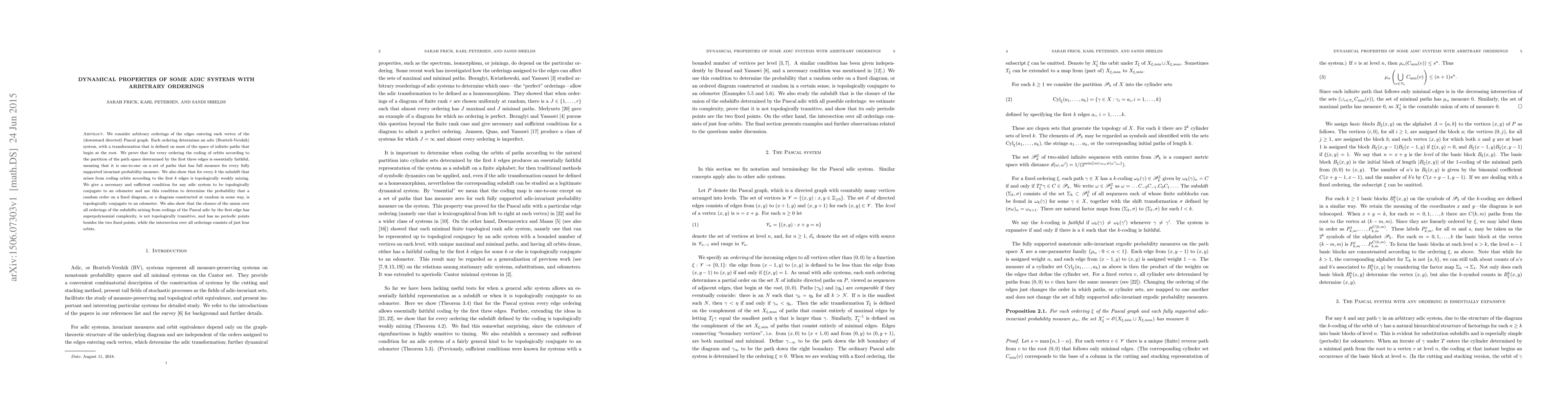 We consider arbitrary orderings of the edges entering each vertex of the (downward directed) Pascal graph. Each ordering determines an adic (Bratteli-Vershik) system, with a transformation that is defined on most of the space of infinite paths that begin at the root. We prove that for every ordering the coding of orbits according to the partition of the path space determined by the first three edges is essentially faithful, meaning that it is one-to-one on a set of paths that has full measure for every fully supported invariant probability measure. We also show that for every $k$ the subshift that arises from coding orbits according to the first $k$ edges is topologically weakly mixing. We give a necessary and sufficient condition for any adic system to be topologically conjugate to an odometer and use this condition to determine the probability that a random order on a fixed diagram, or a diagram constructed at random in some way, is topologically conjugate to an odometer. We also show that the closure of the union over all orderings of the subshifts arising from codings of the Pascal adic by the first edge has superpolynomial complexity, is not topologically transitive, and has no periodic points besides the two fixed points, while the intersection over all orderings consists of just four orbits.