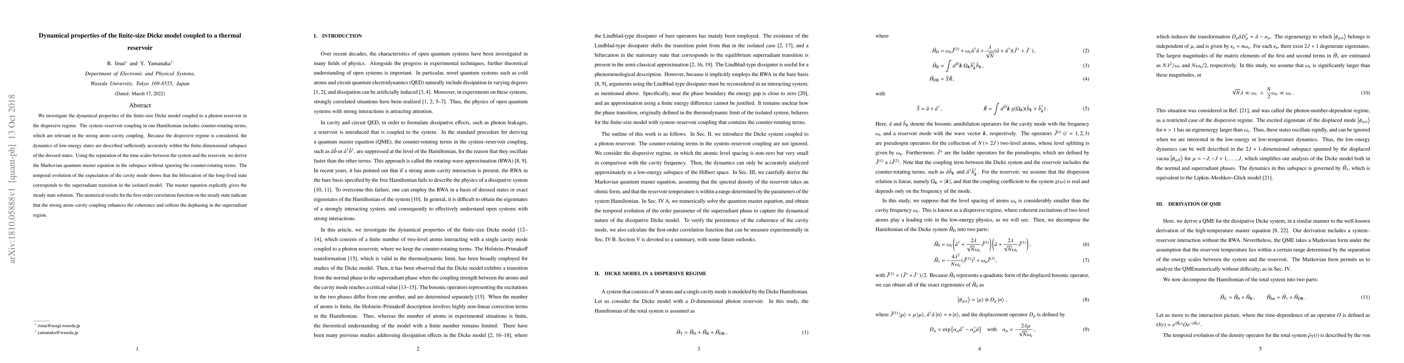 This paper examines the dynamical properties of the finite-size Dicke model in the dispersive regime, coupled to a photon reservoir, focusing on the effects of counter-rotating terms. It derives a Markovian quantum master equation that captures the system's evolution, revealing enhanced coherence and reduced dephasing in the strong atom-cavity coupling regime.