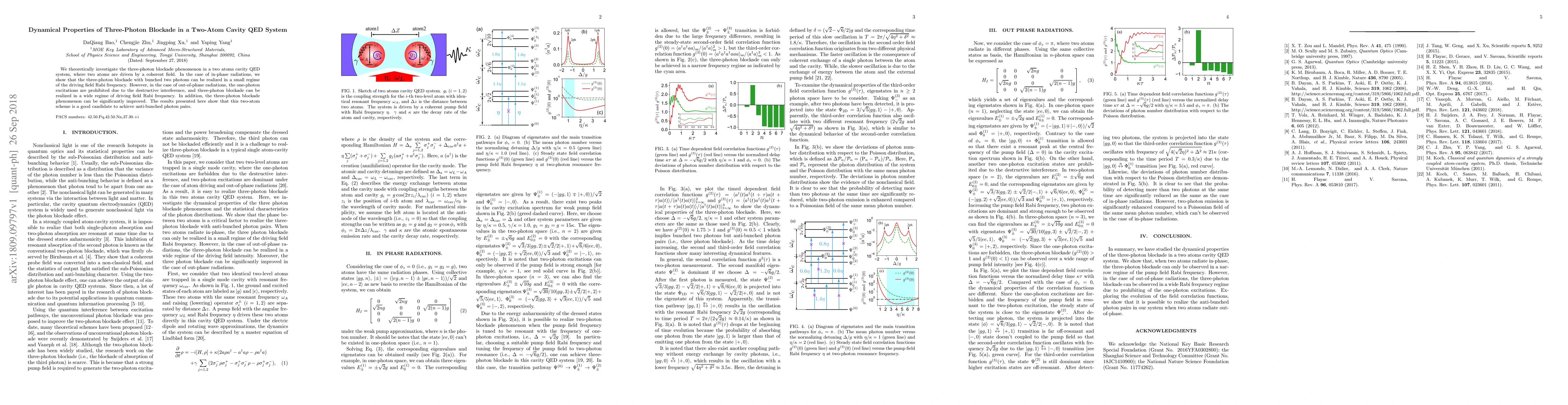 Summary: This paper explores the three-photon blockade in a two-atom cavity QED system driven by coherent fields, demonstrating that in-phase radiations achieve blockade in a small driving frequency regime, while out-of-phase radiations enable blockade across a wider range and significantly enhance the phenomenon, making the system a strong candidate for generating anti-bunched photon pairs.