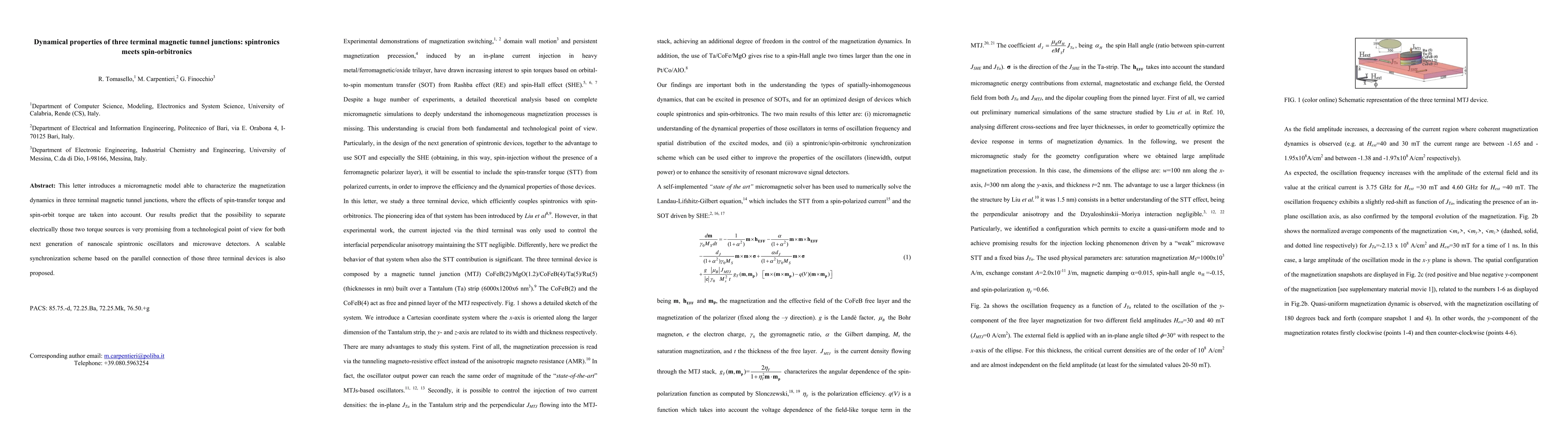 This paper presents a micromagnetic model for three terminal magnetic tunnel junctions, highlighting the dynamics of spin-transfer and spin-orbit torques. The study suggests promising technological applications in next-generation spintronic oscillators and microwave detectors, along with a scalable synchronization scheme for these devices.