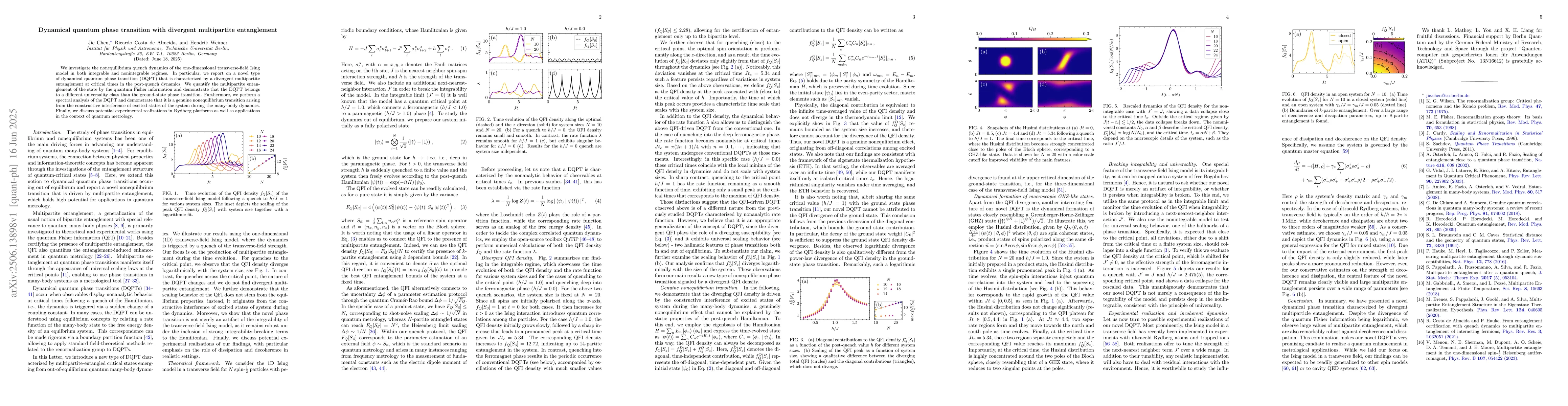 We investigate the nonequilibrium quench dynamics of the one-dimensional transverse-field Ising model in both integrable and nonintegrable regimes. In particular, we report on a novel type of dynamical quantum phase transition (DQPT) that is characterized by a divergent multipartite entanglement at critical times in the post-quench dynamics. We quantify the multipartite entanglement of the state by the quantum Fisher information and demonstrate that the DQPT belongs to a different universality class than the ground-state phase transition. Furthermore, we perform a spectral analysis of the DQPT and demonstrate that it is a genuine nonequilibrium transition arising from the constructive interference of excited states of the system during the many-body dynamics. Finally, we discuss potential experimental realizations in Rydberg platforms as well as applications in the context of quantum metrology.