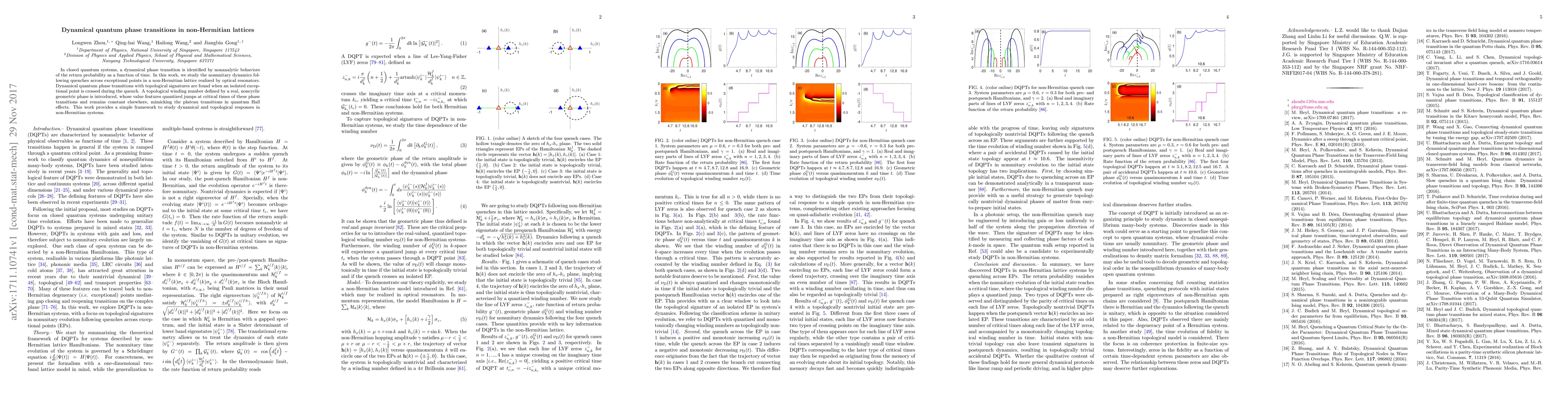 The paper explores dynamical quantum phase transitions in non-Hermitian lattices, identifying nonanalytic behaviors in return probabilities following quenches across exceptional points. A topological winding number with a real geometric phase shows quantized jumps at critical times, akin to plateau transitions in quantum Hall effects, offering a framework for studying topological responses in non-Hermitian systems.