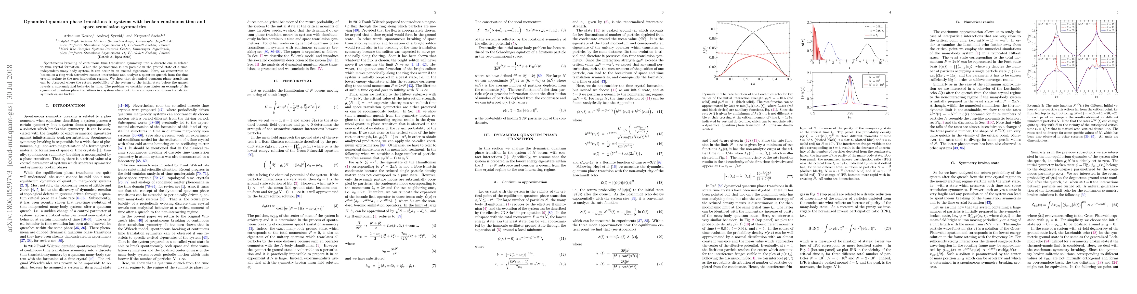 This paper investigates dynamical quantum phase transitions in a system of bosons on a ring with attractive interactions, focusing on the transition from a time crystal regime to a non-interacting regime via quantum quench. It demonstrates that non-analytical behavior in the return probability of the system indicates the occurrence of such transitions, even when both time and space translation symmetries are broken.