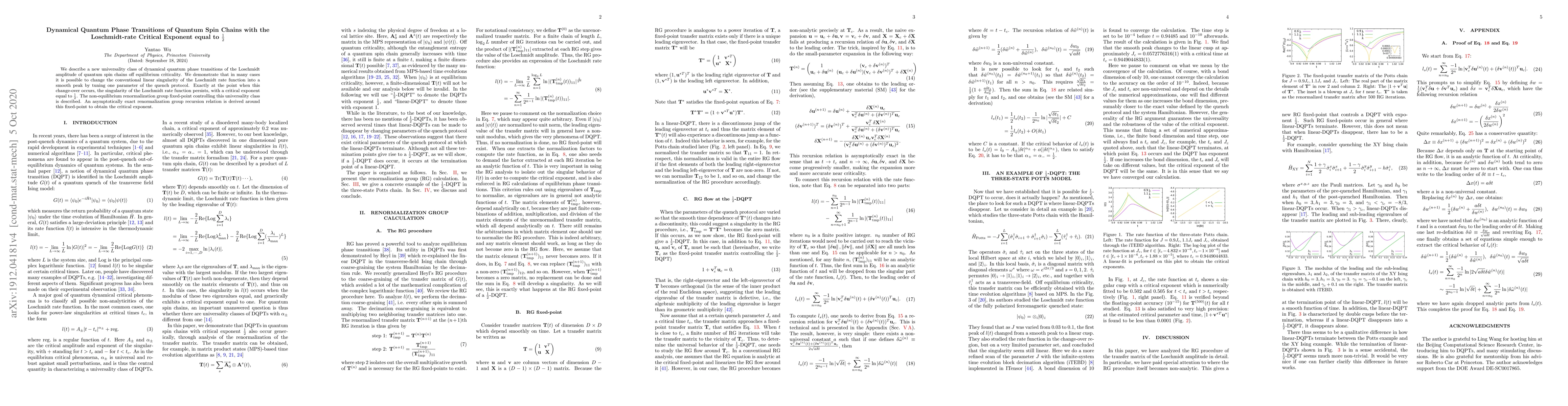 We describe a new universality class of dynamical quantum phase transitions of the Loschmidt amplitude of quantum spin chains off equilibrium criticality. We demonstrate that in many cases it is possible to change the conventional linear singularity of the Loschmidt rate function into a smooth peak by tuning one parameter of the quench protocol. Exactly at the point when this change-over occurs, the singularity of the Loschmidt rate function persists, with a critical exponent equal to $\frac{1}{2}$ . The non-equilibrium renormalization group fixed-point controlling this universality class is described. An asymptotically exact renormalization group recursion relation is derived around this fixed-point to obtain the critical exponent.
