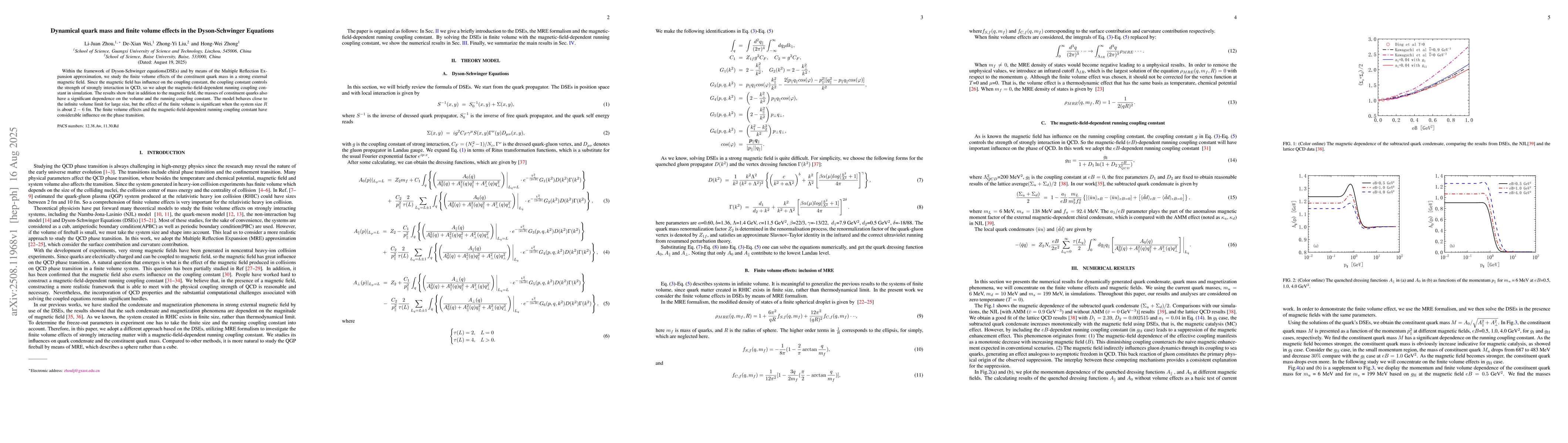 Within the framework of Dyson-Schwinger equations(DSEs) and by means of the Multiple Reflection Expansion approximation, we study the finite volume effects of the constituent quark mass in a strong external magnetic field. Since the magnetic field has influence on the coupling constant, the coupling constant controls the strength of strongly interaction in QCD, so we adopt the magnetic-field-dependent running coupling constant in simulation. The results show that in addition to the magnetic field, the masses of constituent quarks also have a significant dependence on the volume and the running coupling constant. The model behaves close to the infinite volume limit for large size, but the effect of the finite volume is significant when the system size $R$ is about $2-6$ fm.The finite volume effects and the magnetic-field-dependent running coupling constant have considerable influence on the phase transition.