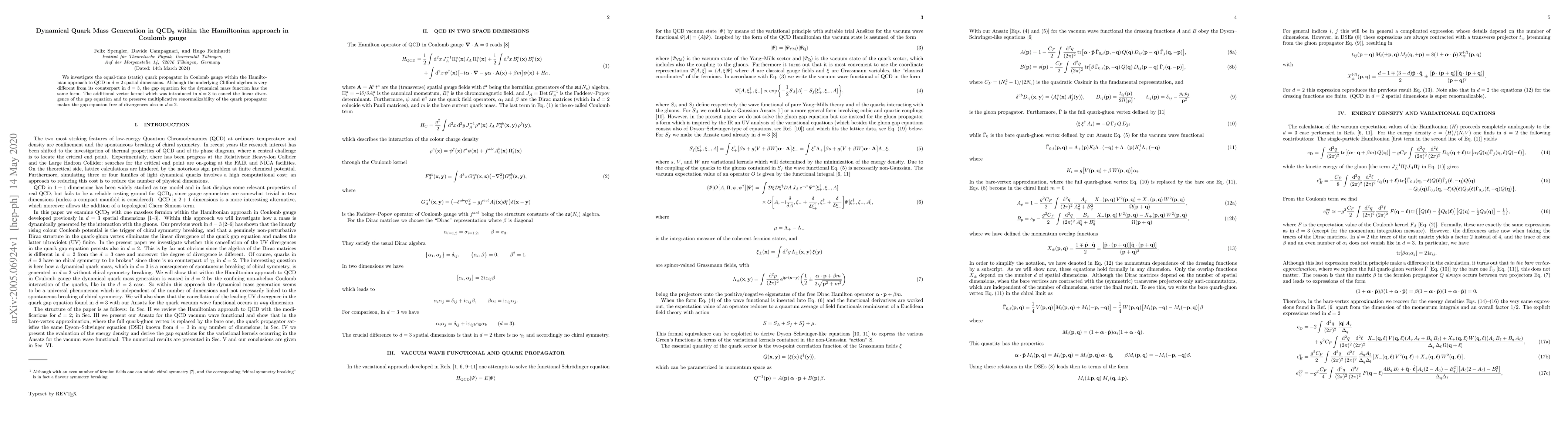 We investigate the equal-time (static) quark propagator in Coulomb gauge within the Hamiltonian approach to QCD in $d=2$ spatial dimensions. Although the underlying Clifford algebra is very different from its counterpart in $d=3$, the gap equation for the dynamical mass function has the same form. The additional vector kernel which was introduced in $d=3$ to cancel the linear divergence of the gap equation and to preserve multiplicative renormalizability of the quark propagator makes the gap equation free of divergences also in $d=2$.