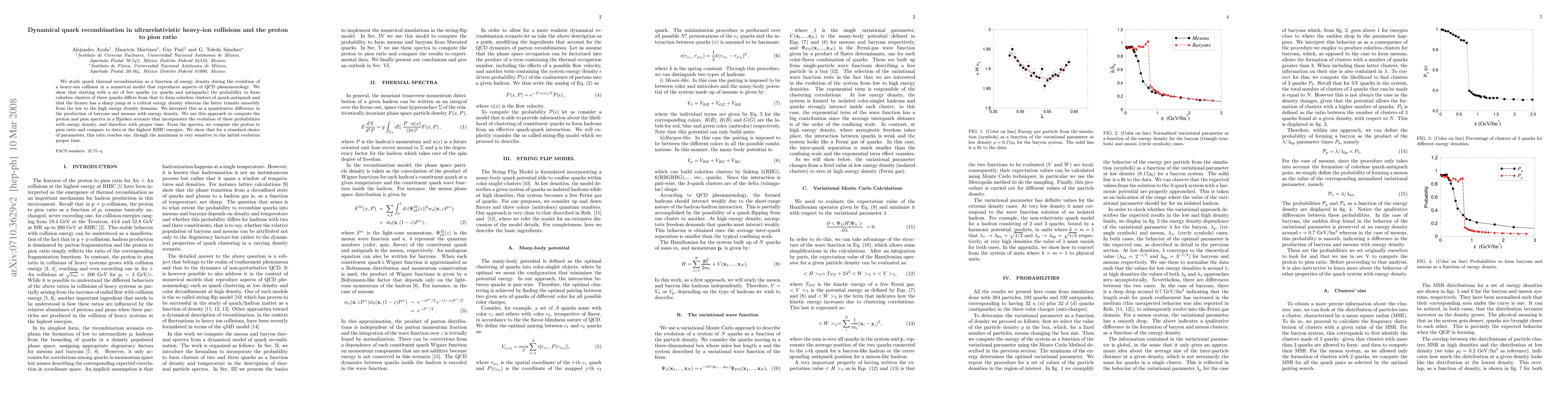 We study quark thermal recombination as a function of energy density during the evolution of a heavy-ion collision in a numerical model that reproduces aspects of QCD phenomenology. We show that starting with a set of free quarks (or quarks and antiquarks) the probability to form colorless clusters of three quarks differs from that to form colorless clusters of quark-antiquark and that the former has a sharp jump at a critical energy density whereas the latter transits smoothly from the low to the high energy density domains. We interpret this as a quantitative difference in the production of baryons and mesons with energy density. We use this approach to compute the proton and pion spectra in a Bjorken scenario that incorporates the evolution of these probabilities with energy density, and therefore with proper time. From the spectra, we compute the proton to pion ratio and compare to data at the highest RHIC energies. We show that for a standard choice of parameters, this ratio reaches one, though the maximum is very sensitive to the initial evolution proper time.