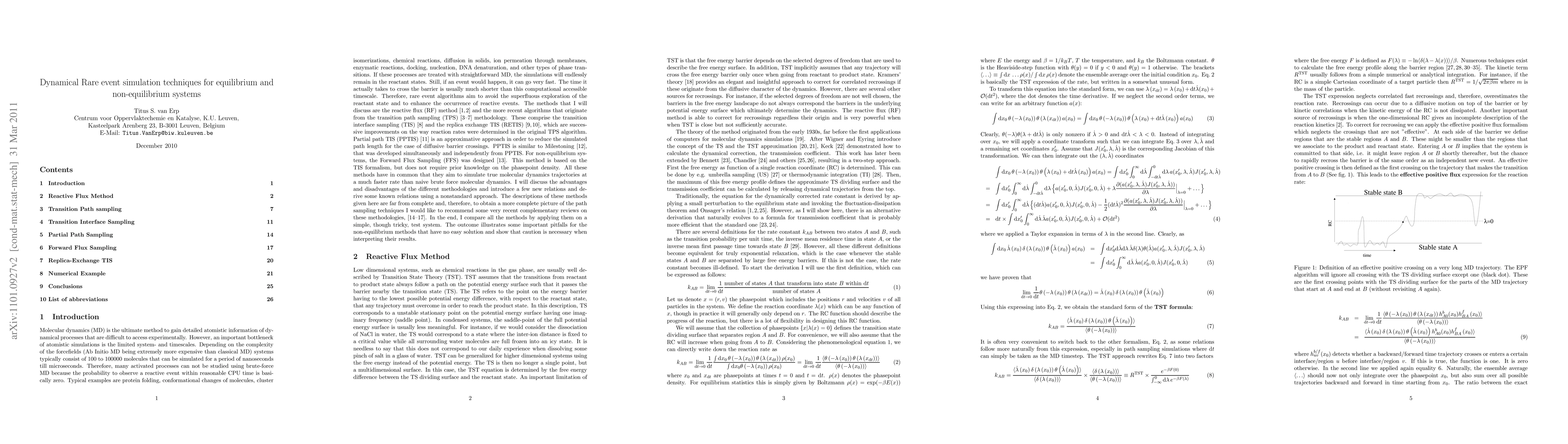 I give an overview of rare event simulation techniques to generate dynamical pathways across high free energy barriers. The methods on which I will concentrate are the reactive flux approach, transition path sampling, (replica-exchange) transition interface sampling, partial path sampling/milestoning, and forward flux sampling. These methods have in common that they aim to simulate true molecular dynamics trajectories at a much faster rate than naive brute force molecular dynamics. The advantages and disadvantages of these methods are discussed and compared for a simple one-dimensional test system. These numerical results reveal some important pitfalls of the present non-equilibrium methods that have no easy solution and show that caution is necessary when interpreting their results.