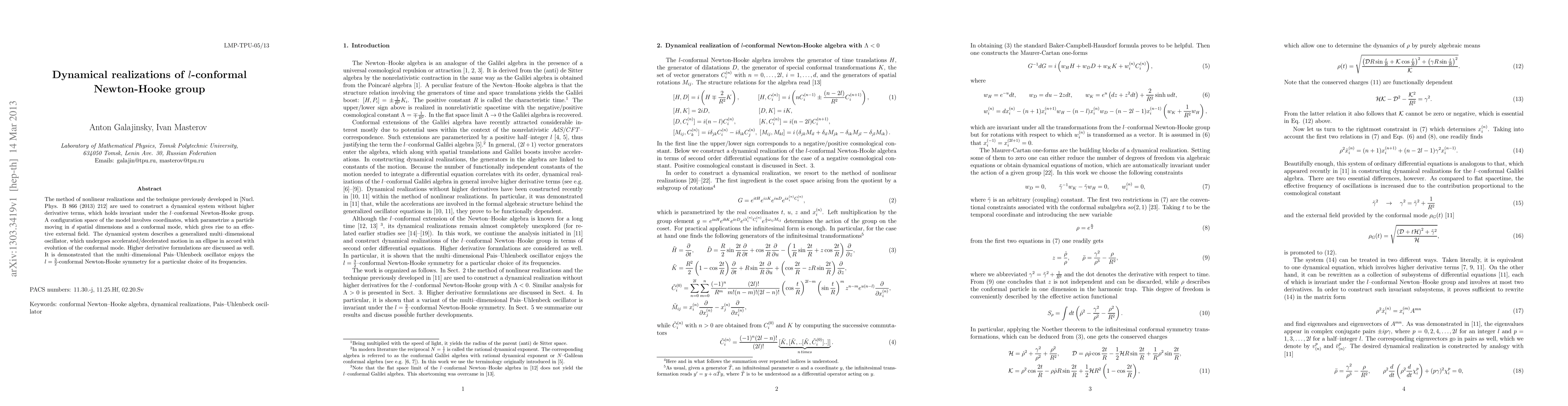 This paper constructs a dynamical system invariant under the l-conformal Newton-Hooke group using nonlinear realizations, describing a generalized multi-dimensional oscillator with accelerated/decelerated motion in an ellipse. It also explores higher derivative formulations and finds that the Pais-Uhlenbeck oscillator exhibits l=3/2-conformal Newton-Hooke symmetry under specific frequency conditions.