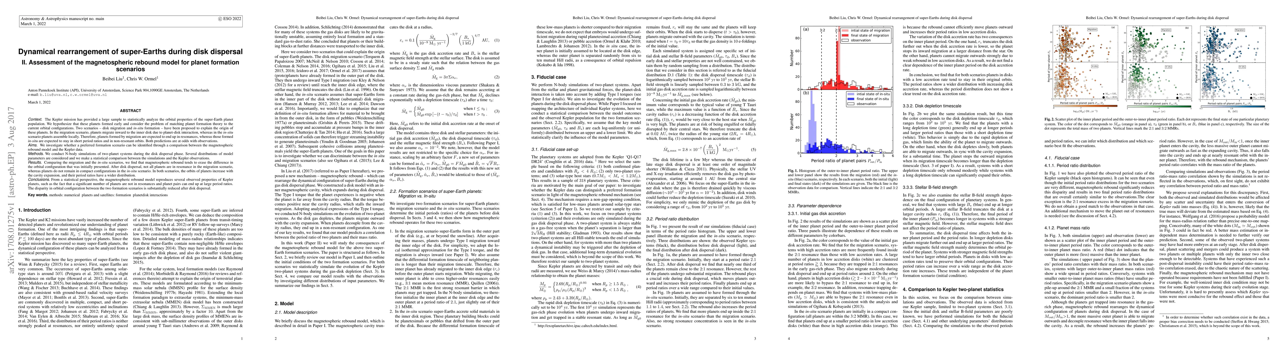 Context.The Kepler mission has provided a large sample to statistically analyze the orbital properties of the super-Earth planets. We hypothesize that these planets formed early and consider the problem of matching planet formation theory to the current observations. Two scenarios, disk migration and in-situ formation, have been proposed to explain their origin. In the migration scenario planets migrate inward due to planet-disk interaction, whereas in the in-situ scenario planets assemble locally. Therefore, planets formed by migration are expected to end up in resonances, whereas those formed in-situ are expected to stay in short period ratios and in non-resonant orbits. Both predictions are at odds with observations. Aims. We investigate whether a preferred formation scenario can be identified through a comparison between the magnetospheric rebound model and the Kepler data. Methods. We conduct N-body simulations of two-planet systems during the disk dispersal phase, and make a statistical comparison between the simulations and the Kepler observations. Results. Comparing the two scenarios, we find that magnetospheric rebound tends to erase the difference in the orbital configuration that was initially presented. After disk dispersal, not all planets are in resonance in the migration scenario, whereas planets do not remain in compact configurations in the in-situ scenario. In both scenarios, the orbits of planets increase with the cavity expansion, and their period ratios have a wider distribution. Conclusions. From a statistical perspective, the magnetospheric rebound model reproduces several observed properties of Kepler planets, such as the significant number of planets are not in resonances and planet pairs can end up at large period ratios. The disparity in orbital configuration between the two formation scenarios is substantially reduced after disk dispersal.