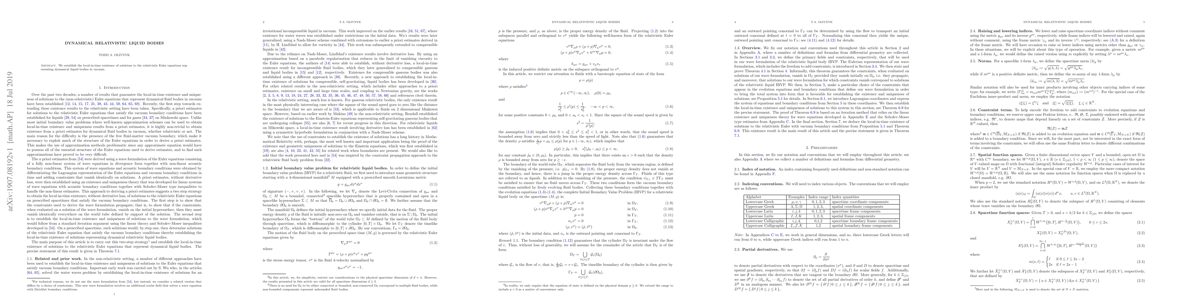 We establish the local-in-time existence of solutions to the relativistic Euler equations representing dynamical liquid bodies in vacuum.