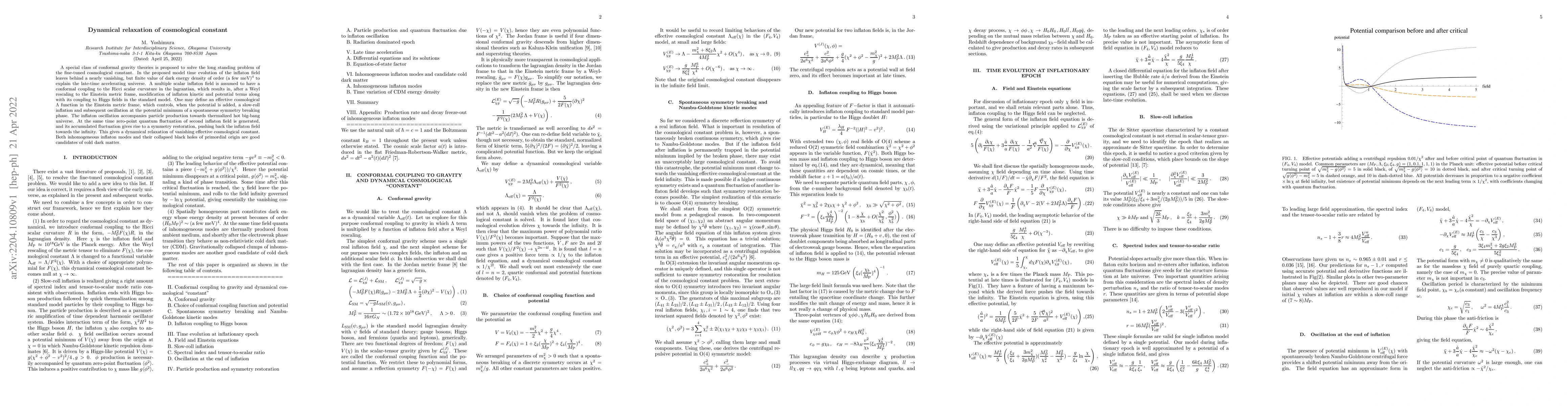 A special class of conformal gravity theories is proposed to solve the long standing problem of the fine-tuned cosmological constant. In the proposed model time evolution of the inflaton field leaves behind a nearly vanishing, but finite value of dark energy density of order (a few meV)$^4$ to explain the late-time accelerating universe. A multiple scalar inflaton field is assumed to have a conformal coupling to the Ricci scalar curvature in the lagrantian, which results in, after a Weyl rescaling to the Einstein metric frame, modification of inflaton kinetic and potential terms along with its coupling to Higgs fields in the standard model. One may define an effective cosmological $\Lambda$ function in the Einstein metric frame, which controls, when the potential is added, a slow-roll inflation and subsequent oscillation at the potential minimum of a spontaneous symmetry breaking phase. The inflaton oscillation accompanies particle production towards thermalized hot big-bang universe. At the same time zero-point quantum fluctuation of second inflaton field is generated,and its accumulated fluctuation gives rise to a symmetry restoration, pushing back the inflaton field towards the infinity. This gives a dynamical relaxation of vanishing effective cosmological constant. Both inhomogeneous inflaton modes and their collapsed black holes of primordial origin are good candidates of cold dark matter.