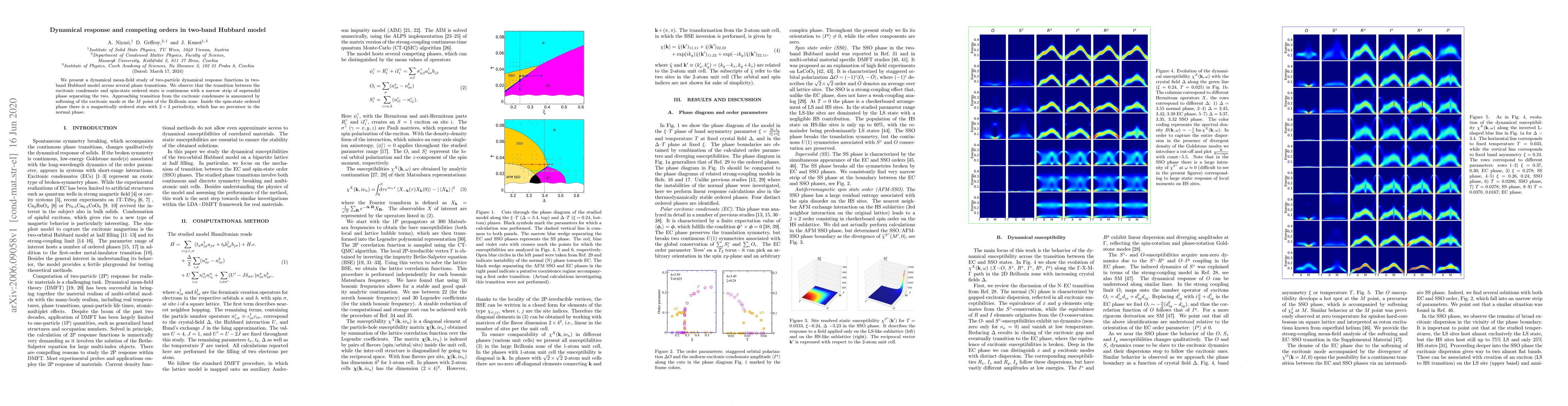 We present a dynamical mean-field study of two-particle dynamical response functions in two-band Hubbard model across several phase transitions. We observe that the transition between theexcitonic condensate and spin-state ordered state is continuous with a narrow strip of supersolidphase separating the two. Approaching transition from the excitonic condensate is announced bysoftening of the excitonic mode at theMpoint of the Brillouin zone. Inside the spin-state orderedphase there is a magnetically ordered state with 2x2 periodicity, which has no precursor in thenormal phase.