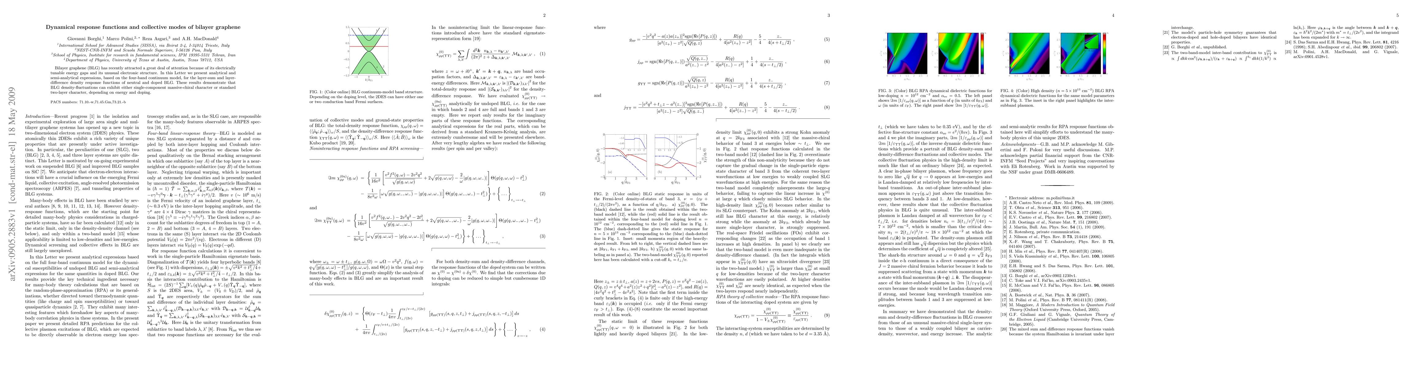 Bilayer graphene (BLG) has recently attracted a great deal of attention because of its electrically tunable energy gaps and its unusual electronic structure. In this Letter we present analytical and semi-analytical expressions, based on the four-band continuum model, for the layer-sum and layer-difference density response functions of neutral and doped BLG. These results demonstrate that BLG density-fluctuations can exhibit either single-component massive-chiral character or standard two-layer character, depending on energy and doping.