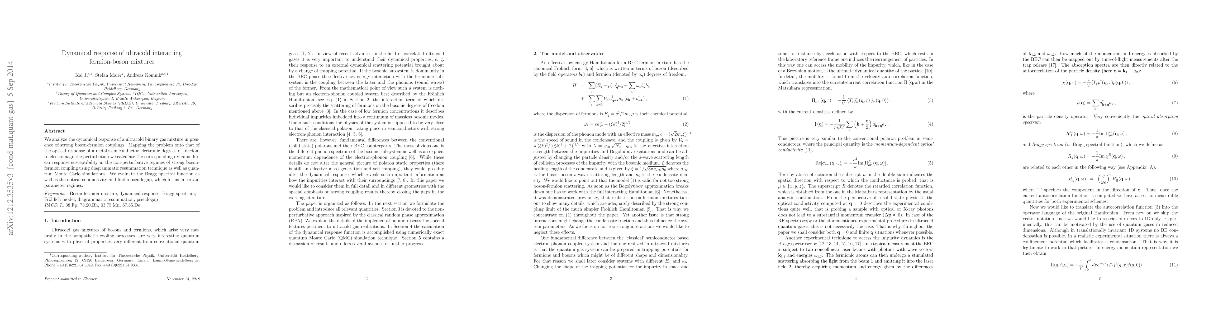 We analyze the dynamical response of a ultracold binary gas mixture in presence of strong boson-fermion couplings. Mapping the problem onto that of the optical response of a metal/semiconductor electronic degrees of freedom to electromagnetic perturbation we calculate the corresponding dynamic linear response susceptibility in the non-perturbative regimes of strong boson-fermion coupling using diagrammatic resummation technique as well as quantum Monte Carlo simulations. We evaluate the Bragg spectral function as well as the optical conductivity and find a pseudogap, which forms in certain parameter regimes.