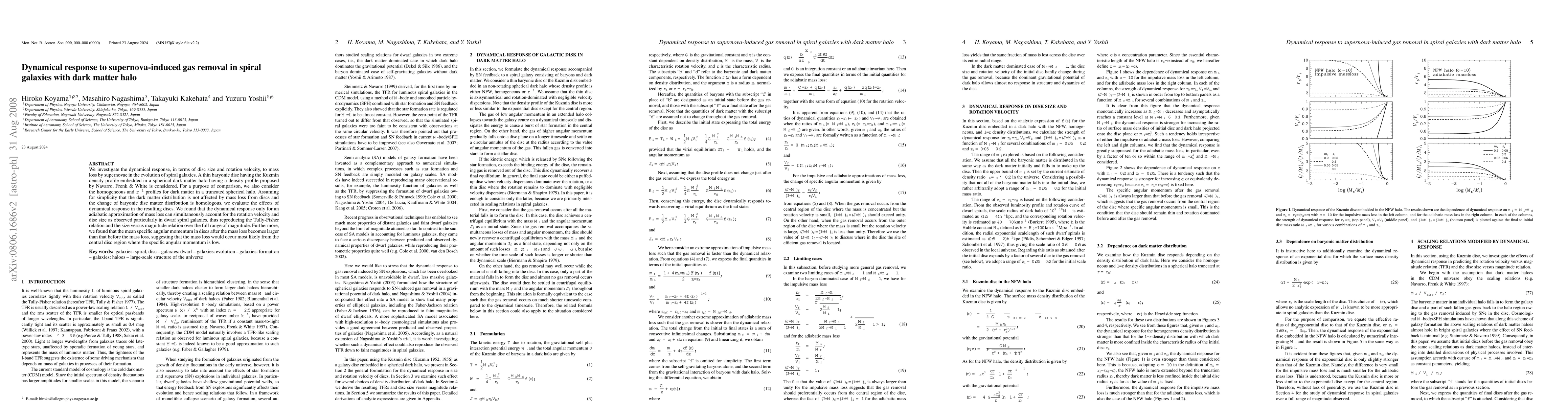 We investigate the dynamical response, in terms of disc size and rotation velocity, to mass loss by supernovae in the evolution of spiral galaxies. A thin baryonic disc having the Kuzmin density profile embedded in a spherical dark matter halo having a density profile proposed by Navarro, Frenk & White is considered. For a purpose of comparison, we also consider the homogeneous and $r^{-1}$ profiles for dark matter in a truncated spherical halo. Assuming for simplicity that the dark matter distribution is not affected by mass loss from discs and the change of baryonic disc matter distribution is homologous, we evaluate the effects of dynamical response in the resulting discs. We found that the dynamical response only for an adiabatic approximation of mass loss can simultaneously account for the rotation velocity and disc size as observed particularly in dwarf spiral galaxies, thus reproducing the Tully-Fisher relation and the size versus magnitude relation over the full range of magnitude. Furthermore, we found that the mean specific angular momentum in discs after the mass loss becomes larger than that before the mass loss, suggesting that the mass loss would occur most likely from the central disc region where the specific angular momentum is low.