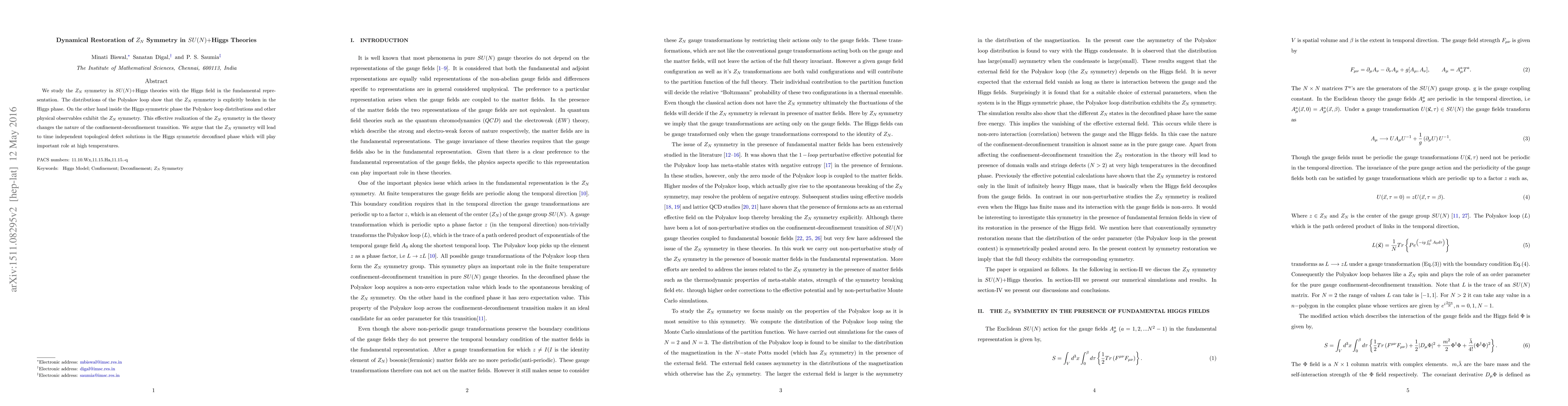 The paper presents a detailed analysis of Z_N symmetry in SU(N)+Higgs theories using Monte Carlo simulations, revealing its restoration in the Higgs symmetric phase and its implications for topological defects and phase transitions.