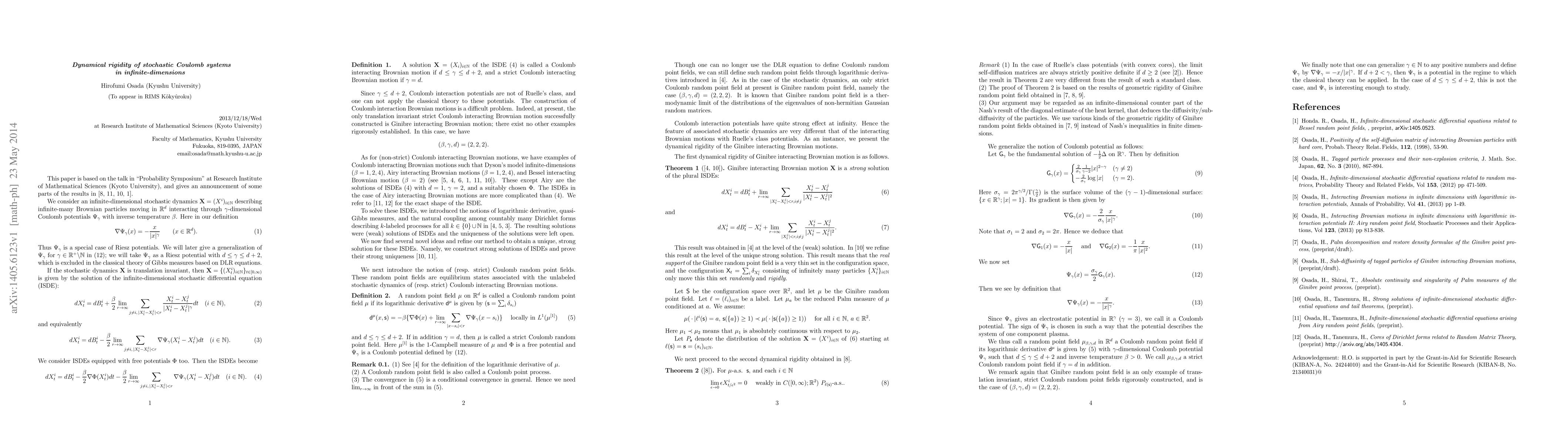 This paper is based on the talk in "Probability Symposium" at Research Institute of Mathematical Sciences (Kyoto University) on 2013/12/18, and gives an announcement of some parts of the results in [1,8,10,11]. We show two instances of dynamical rigidity of Ginibre interacting Brownian motion in infinite dimensions. This stochastic dynamics is given by the infinite-dimensional stochastic differential equation describing infinite-many Brownian particles in the plane interacting through two-dimensional Coulomb potential. The first dynamical rigidity is that the Ginibre interacting Brownian motion is a unique, strong solution of two different infinite dimensional stochastic differential equations. The second shows that the tagged particles of Ginibre interacting Brownian motion are sub diffusive. We also propose the notion of "Coulomb random point fields" and the associated "Coulomb interacting Brownian motions".