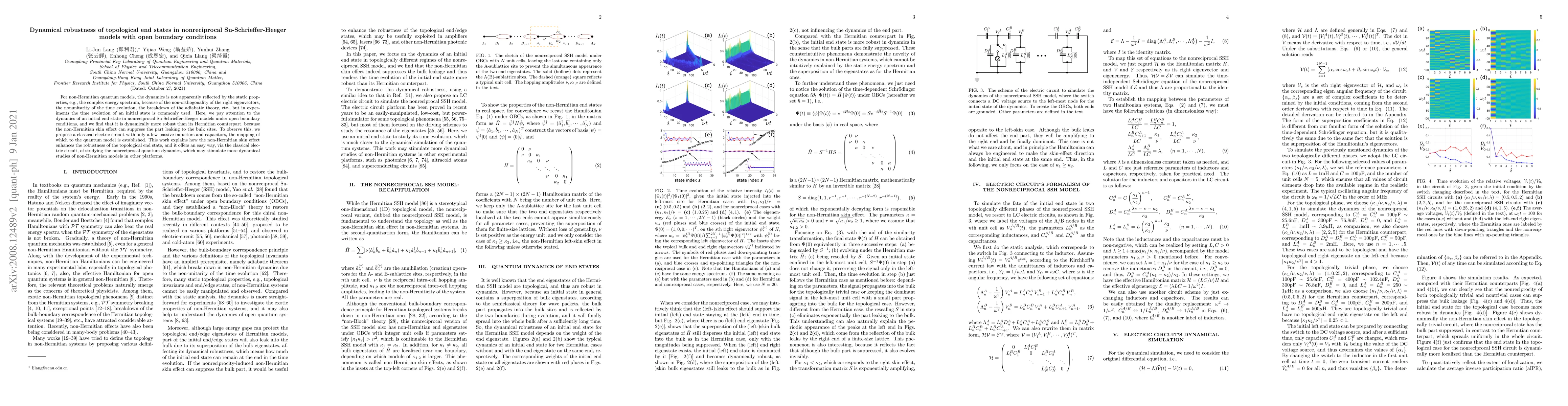This paper investigates the dynamical robustness of topological end states in nonreciprocal Su-Schrieffer-Heeger models with open boundary conditions, finding that the non-Hermitian skin effect enhances this robustness. It also proposes a classical electric circuit to study these dynamics, offering a practical method for exploring nonreciprocal quantum dynamics.