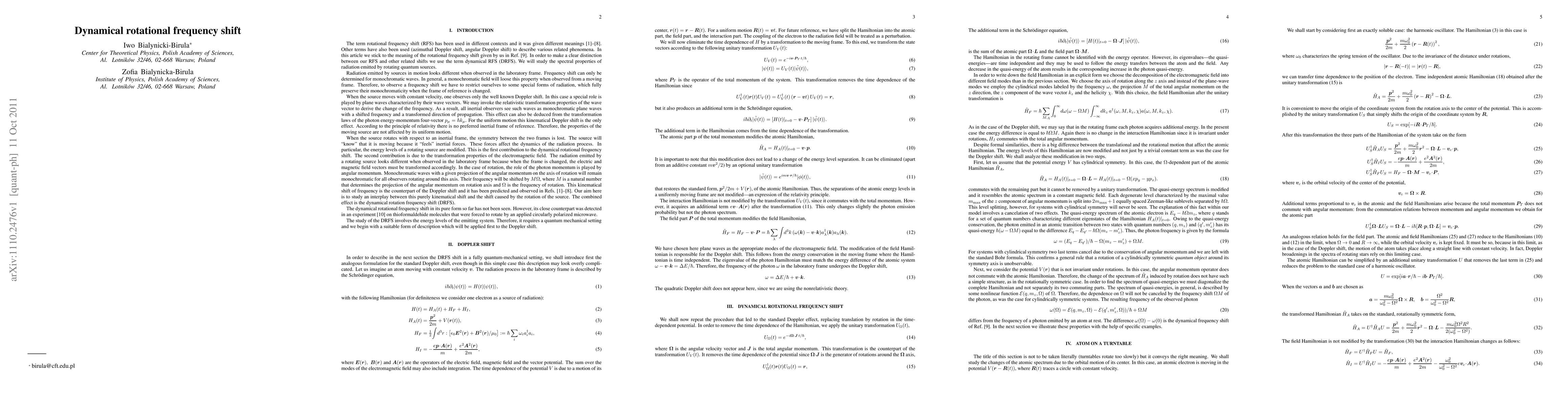 The term rotational frequency shift (RFS) has been used in different contexts and it was given different meanings. Other terms have also been used (azimuthal Doppler shift, angular Doppler shift) to describe various related phenomena. In this article we stick to the meaning of the rotational frequency shift given by us in Phys. Rev. Lett.78, 2539 (1977). In order to make a clear distinction between our RFS and other related shifts we use the term dynamical RFS (DRFS). We will study the spectral properties of radiation emitted by rotating quantum sources.
