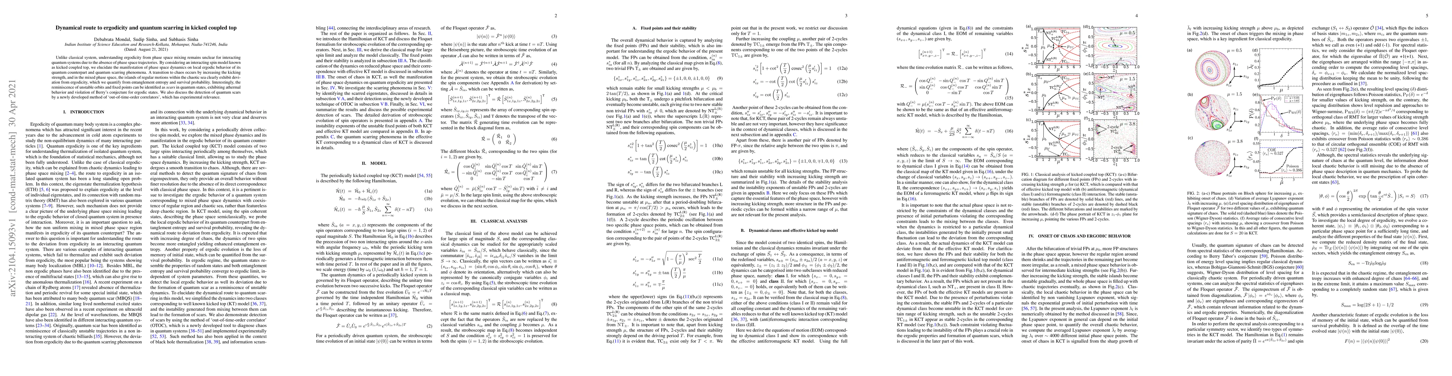 This paper investigates the dynamical route to ergodicity and quantum scarring in a kicked coupled top model, revealing how phase space dynamics influence the local ergodic behavior and quantum scarring. The study finds that increasing kicking strength leads to chaos, with islands of regular motion showing deviations from ergodicity, and identifies quantum scars through entanglement entropy and survival probability, challenging Berry's conjecture.