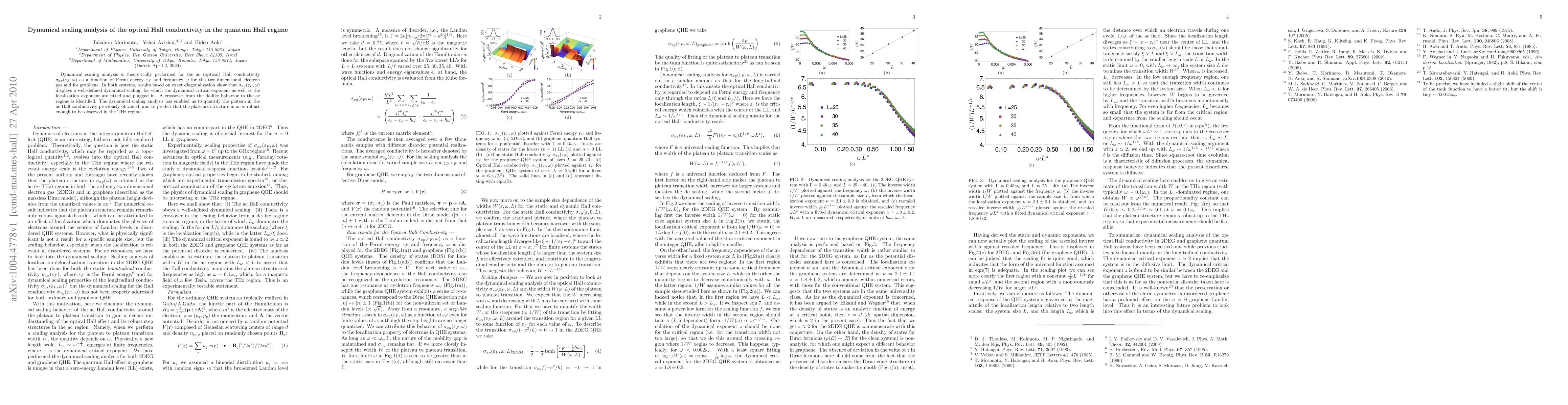 Dynamical scaling analysis was performed for the ac (optical) Hall conductivity $\sigma_{xy}(\varepsilon_F,\omega)$ in two-dimensional electron gas and graphene using exact diagonalization. The study identified a crossover from dc-like behavior to the ac regime and quantified the plateau in ac Hall conductivity, predicting its robustness in the THz regime.