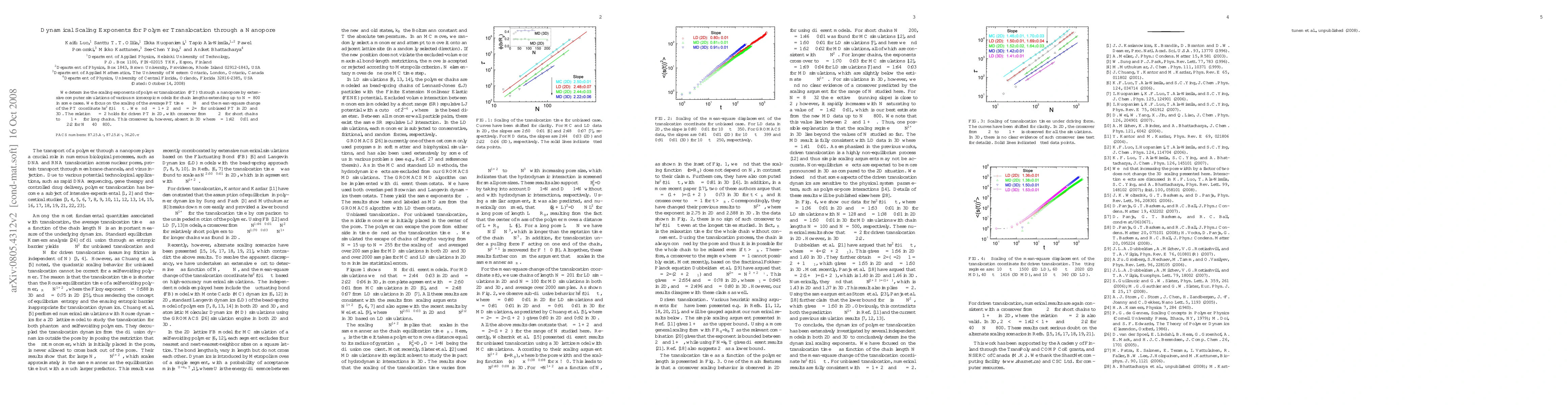 Researchers studied polymer translocation through a nanopore using computer simulations, finding scaling exponents for average translocation time and mean-square displacement in 2D and 3D systems.
