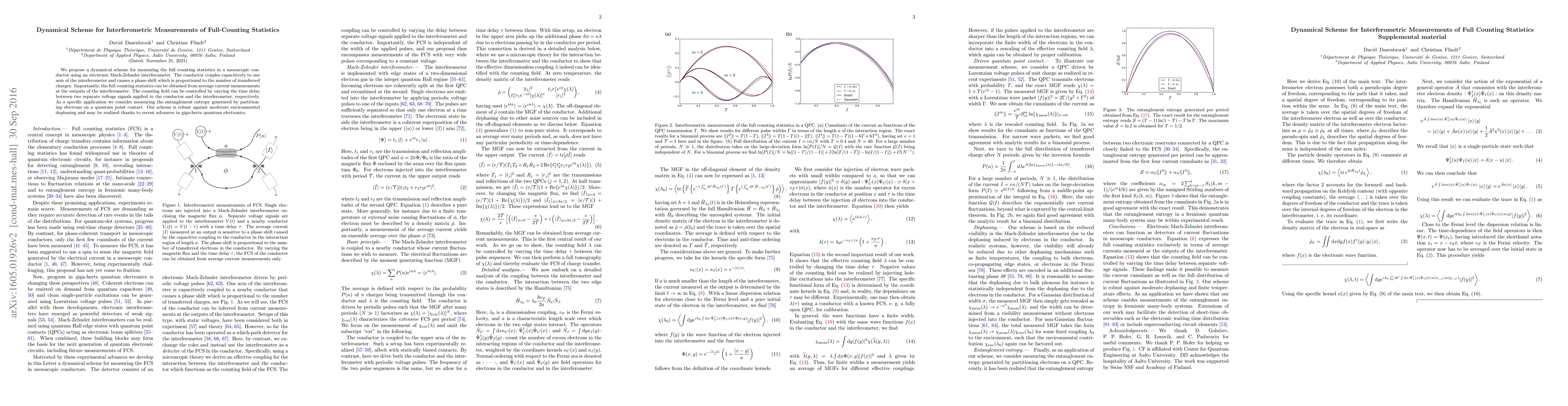 This paper proposes a dynamical scheme for measuring full counting statistics in a mesoscopic conductor via an electronic Mach-Zehnder interferometer. The method allows for the determination of entanglement entropy by controlling the counting field through time delays between voltage signals, demonstrating robustness against moderate dephasing.