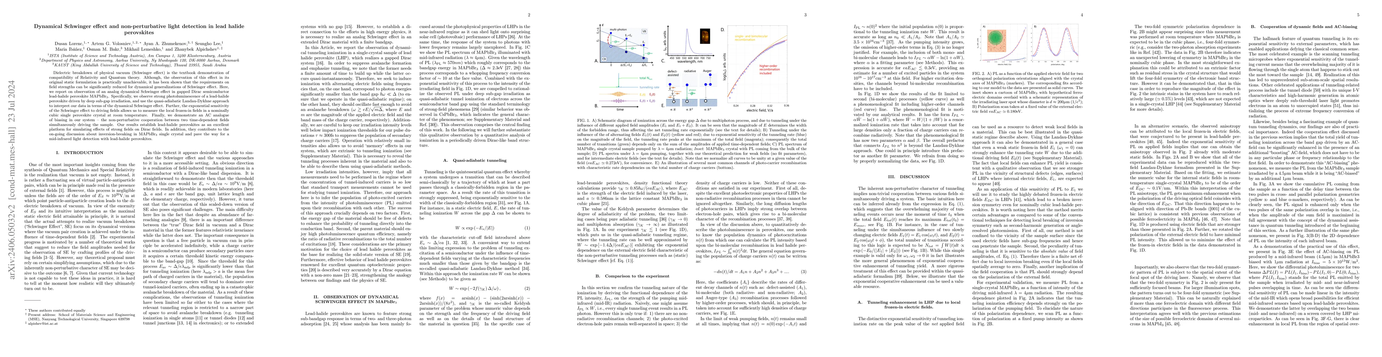 This research reveals strong photoluminescence in lead-halide perovskites due to the dynamical Schwinger effect, indicating tunneling ionization in strong fields, and demonstrates its utility for measuring local fields and simulating effects on Dirac fields. The findings also suggest potential for mid-infrared light detection.