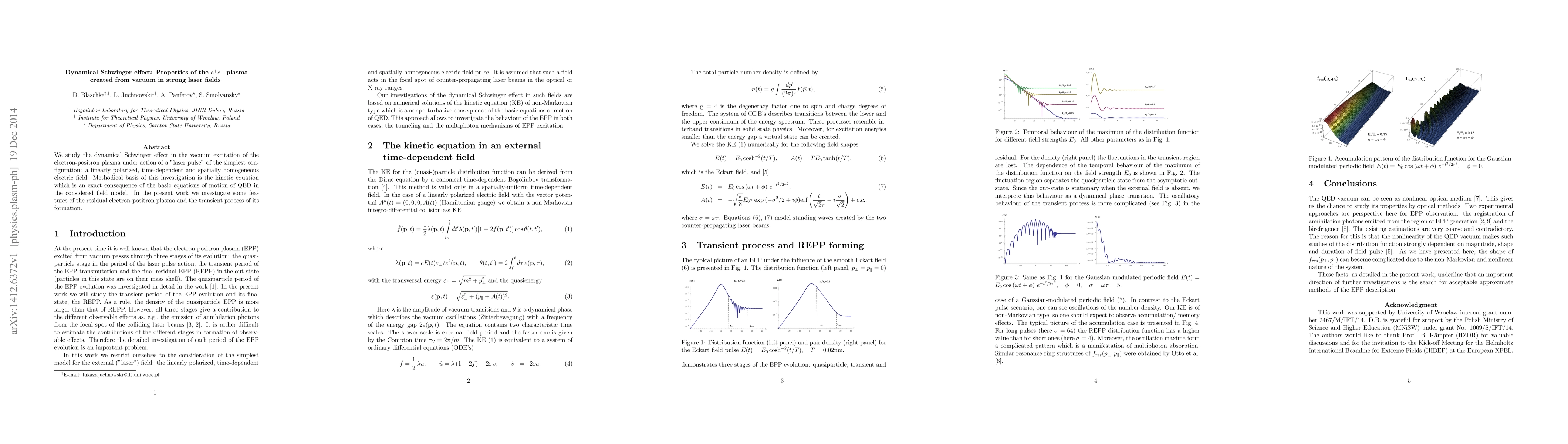 This paper investigates the dynamical Schwinger effect, focusing on the vacuum excitation of electron-positron plasma under a strong, linearly polarized laser pulse. The study employs a kinetic equation derived from QED to explore the properties and transient formation process of the resulting plasma.