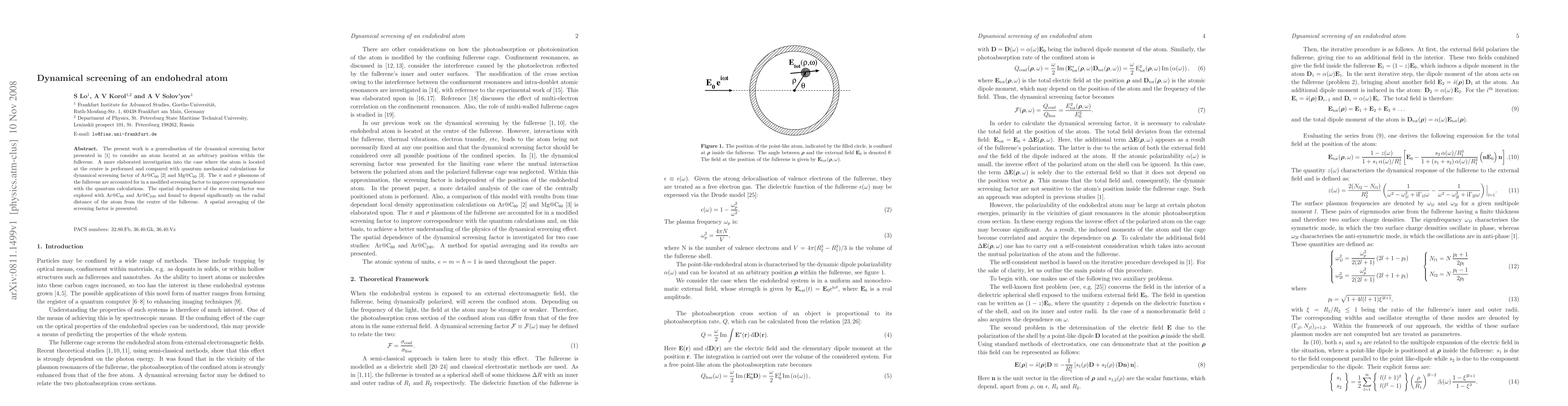 The present work is a generalisation of the dynamical screening factor presented in [1] to consider an atom located at an arbitrary position within the fullerene. A more elaborated investigation into the case where the atom is located at the centre is performed and compared with quantum mechanical calculations for dynamical screening factor of Ar@C$_{60}$ [2] and Mg@C$_{60}$ [3]. The $\pi$ and $\sigma$ plasmons of the fullerene are accounted for in a modified screening factor to improve correspondence with the quantum calculations. The spatial dependence of the screening factor was explored with Ar@C$_{60}$ and Ar@C$_{240}$ and found to depend significantly on the radial distance of the atom from the centre of the fullerene. A spatial averaging of the screening factor is presented.