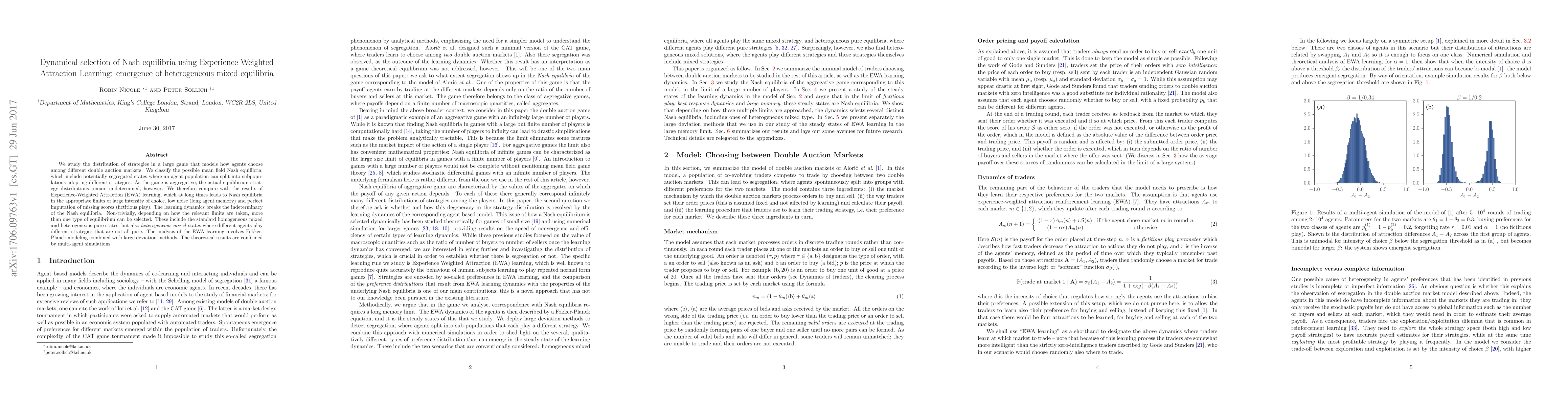 This paper investigates the emergence of heterogeneous mixed equilibria in a large game modeling double auction markets, using Experience-Weighted Attraction Learning. It finds that the dynamics of EWA learning can select multiple types of equilibria, including heterogeneous mixed states where agents adopt diverse strategies, breaking the indeterminacy of classical Nash equilibria.