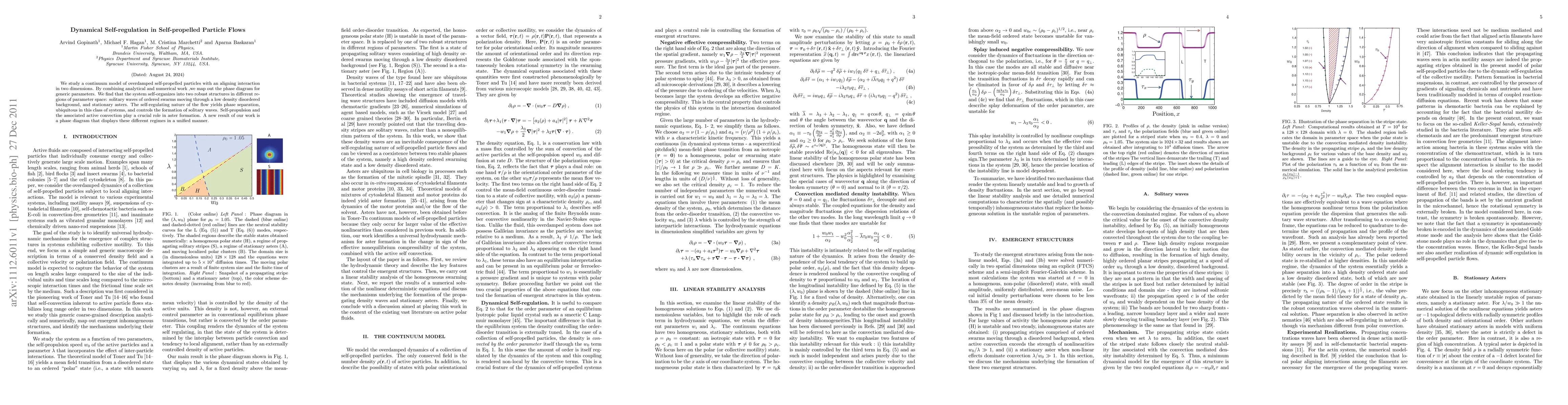 This paper explores a continuum model of self-propelled particles with aligning interactions, revealing self-organization into solitary waves and stationary asters through dynamical self-regulation. The study provides a comprehensive phase diagram that delineates these distinct regimes, highlighting the role of self-propulsion in system behavior.