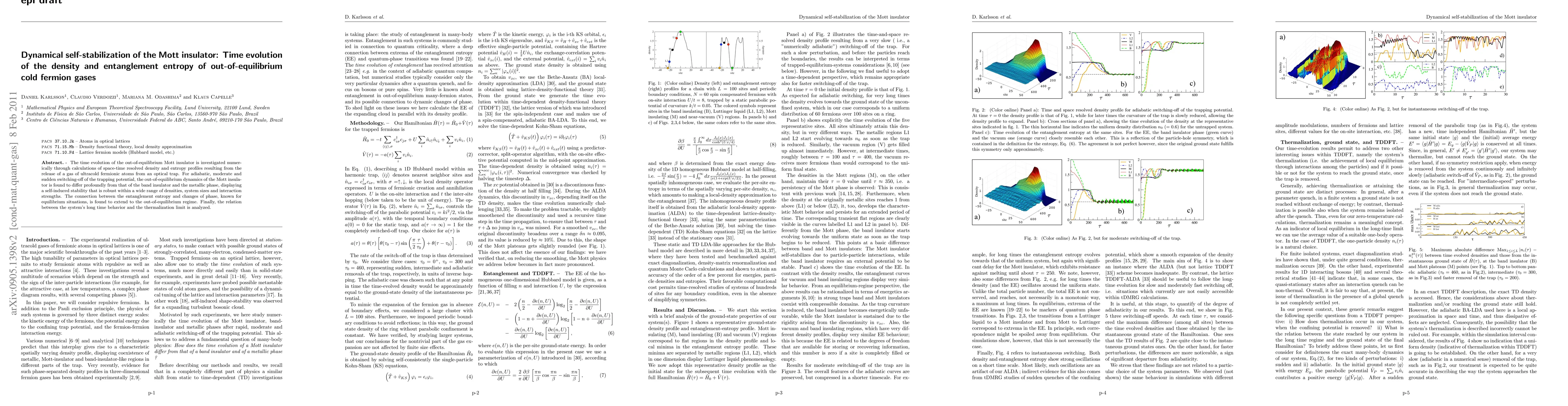 The time evolution of the out-of-equilibrium Mott insulator is investigated numerically through calculations of space-time resolved density and entropy profiles resulting from the release of a gas of ultracold fermionic atoms from an optical trap. For adiabatic, moderate and sudden switching-off of the trapping potential, the out-of-equilibrium dynamics of the Mott insulator is found to differ profoundly from that of the band insulator and the metallic phase, displaying a self-induced stability that is robust within a wide range of densities, system sizes and interaction strengths. The connection between the entanglement entropy and changes of phase, known for equilibrium situations, is found to extend to the out-of-equilibrium regime. Finally, the relation between the system's long time behavior and the thermalization limit is analyzed.