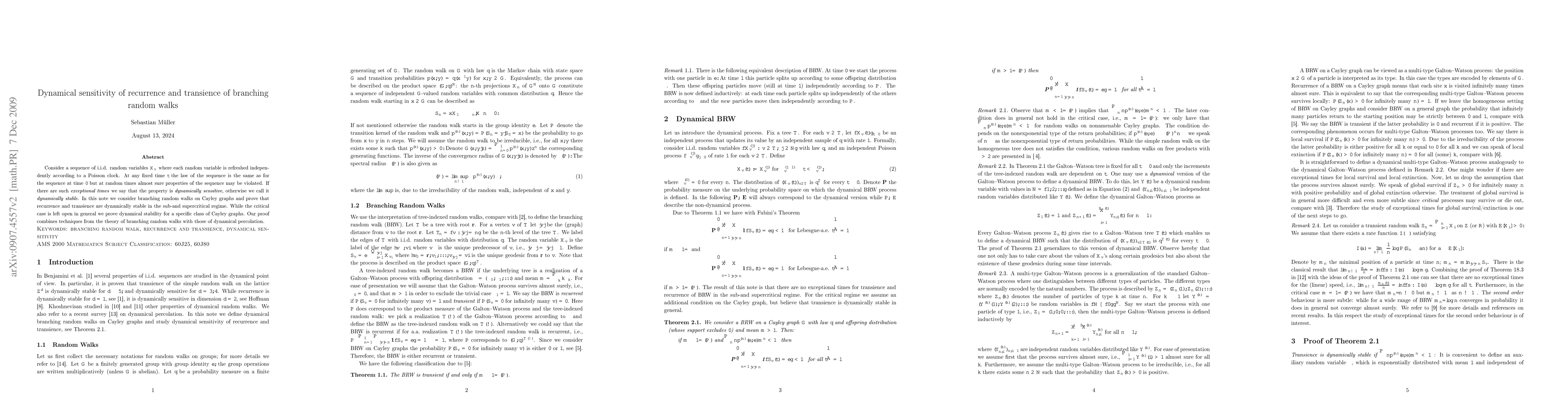 Consider a sequence of i.i.d. random variables $X_n$ where each random variable is refreshed independently according to a Poisson clock. At any fixed time $t$ the law of the sequence is the same as for the sequence at time 0 but at random times almost sure properties of the sequence may be violated. If there are such \emph{exceptional times} we say that the property is \emph{dynamically sensitive}, otherwise we call it \emph{dynamically stable}. In this note we consider branching random walks on Cayley graphs and prove that recurrence and transience are dynamically stable in the sub-and supercritical regime. While the critical case is left open in general we prove dynamical stability for a specific class of Cayley graphs. Our proof combines techniques from the theory of ranching random walks with those of dynamical percolation.