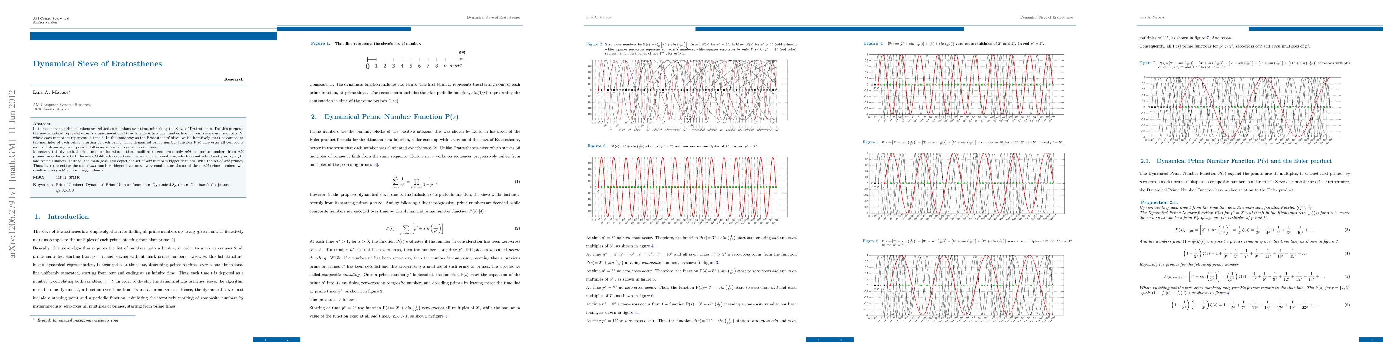 In this document, prime numbers are related as functions over time, mimicking the Sieve of Eratosthenes. For this purpose, the mathematical representation is a uni-dimentional time line depicting the number line for positive natural numbers N, where each number n represents a time t. In the same way as the Eratosthenes' sieve, which iteratively mark as composite the multiples of each prime, starting at each prime. This dynamical prime number function P(s) zero-cross all composite numbers departing from primes, following a linear progression over time.