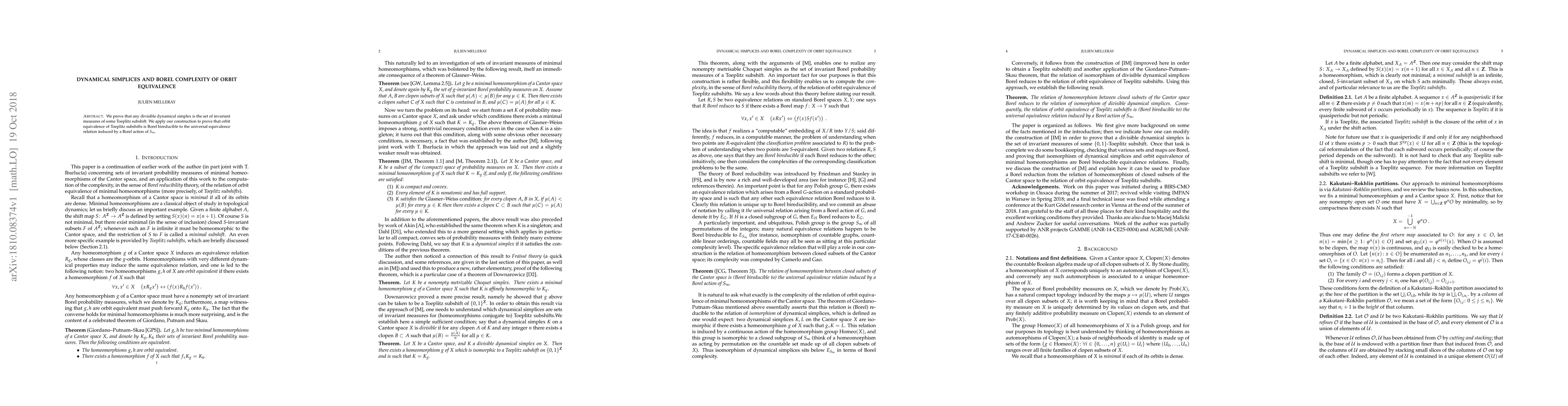 This paper demonstrates that divisible dynamical simplices correspond to invariant measures of Toeplitz subshifts and shows that orbit equivalence of Toeplitz subshifts is Borel bireducible to the universal equivalence relation from a Borel action of a nonarchimedean Polish group.