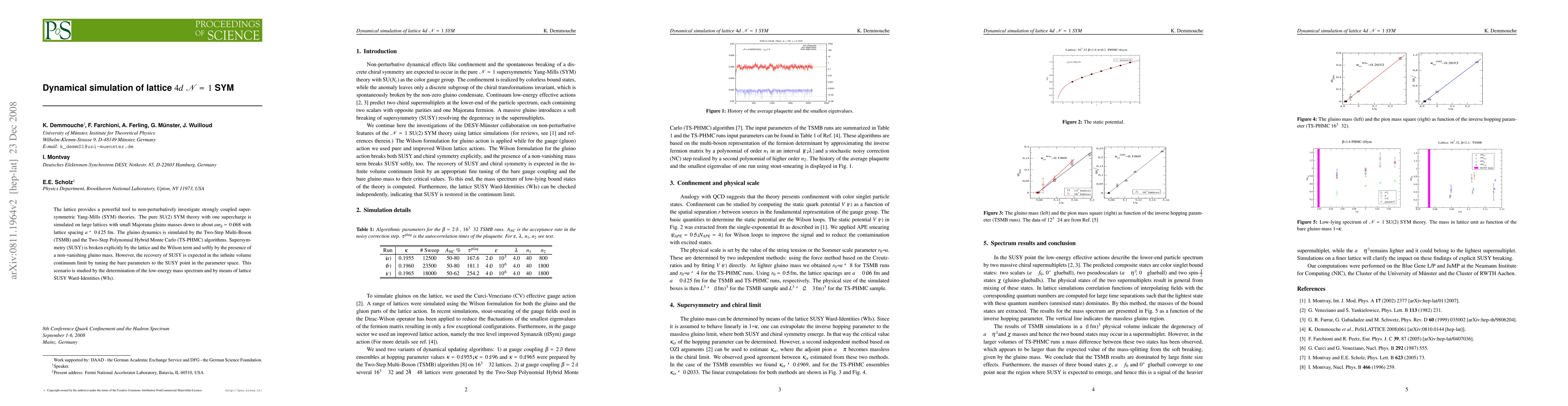 This paper investigates the non-perturbative dynamics of lattice 4d N=1 supersymmetric Yang-Mills (SYM) using large lattices and simulations with the TSMB and TS-PHMC algorithms. The study aims to recover supersymmetry in the continuum limit by analyzing the low-energy mass spectrum and employing lattice SUSY Ward-Identities.