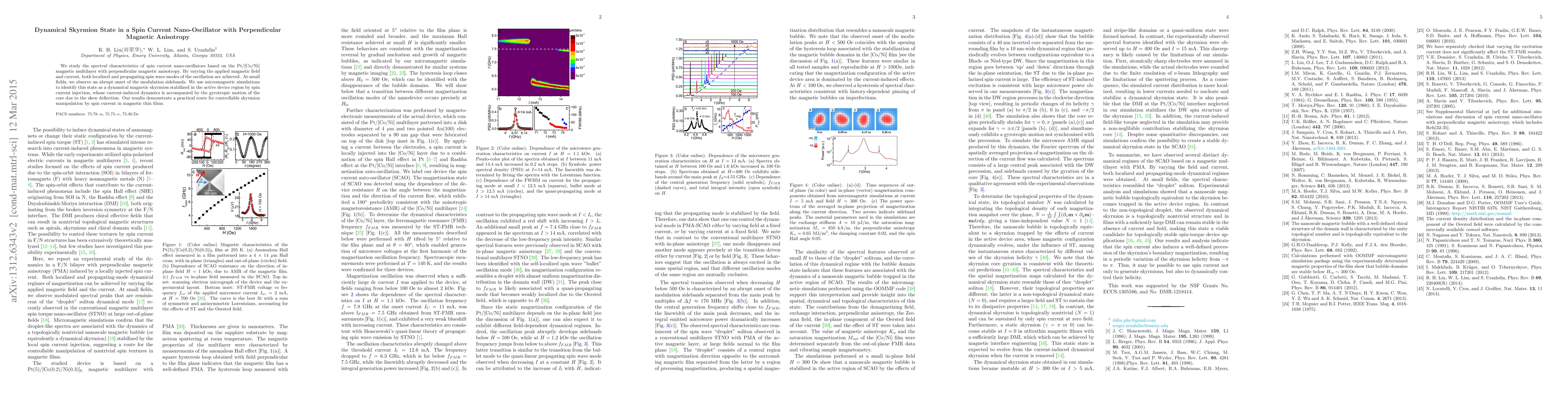 We study the spectral characteristics of spin current nano-oscillators based on the Pt/[Co/Ni] magnetic multilayer with perpendicular magnetic anisotropy. By varying the applied magnetic field and current, both localized and propagating spin wave modes of the oscillation are achieved. At small fields, we observe an abrupt onset of the modulation sidebands. We use micromagnetic simulations to identify this state as a dynamical magnetic skyrmion stabilized in the active device region by spin current injection, whose current-induced dynamics is accompanied by the gyrotropic motion of the core due to the skew deflection. Our results demonstrate a practical route for controllable skyrmion manipulation by spin current in magnetic thin films.