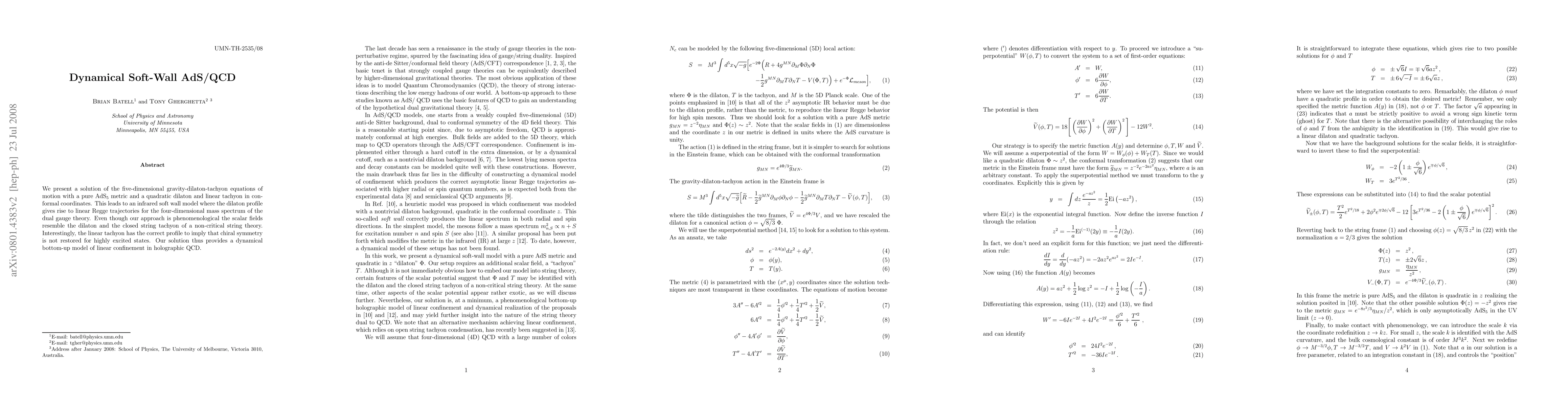 We present a solution of the five-dimensional gravity-dilaton-tachyon equations of motion with a pure AdS_5 metric and a quadratic dilaton and linear tachyon in conformal coordinates. This leads to an infrared soft wall model where the dilaton profile gives rise to linear Regge trajectories for the four-dimensional mass spectrum of the dual gauge theory. Even though our approach is phenomenological the scalar fields resemble the dilaton and the closed string tachyon of a non-critical string theory. Interestingly, the linear tachyon has the correct profile to imply that chiral symmetry is not restored for highly excited states. Our solution thus provides a dynamical bottom-up model of linear confinement in holographic QCD.