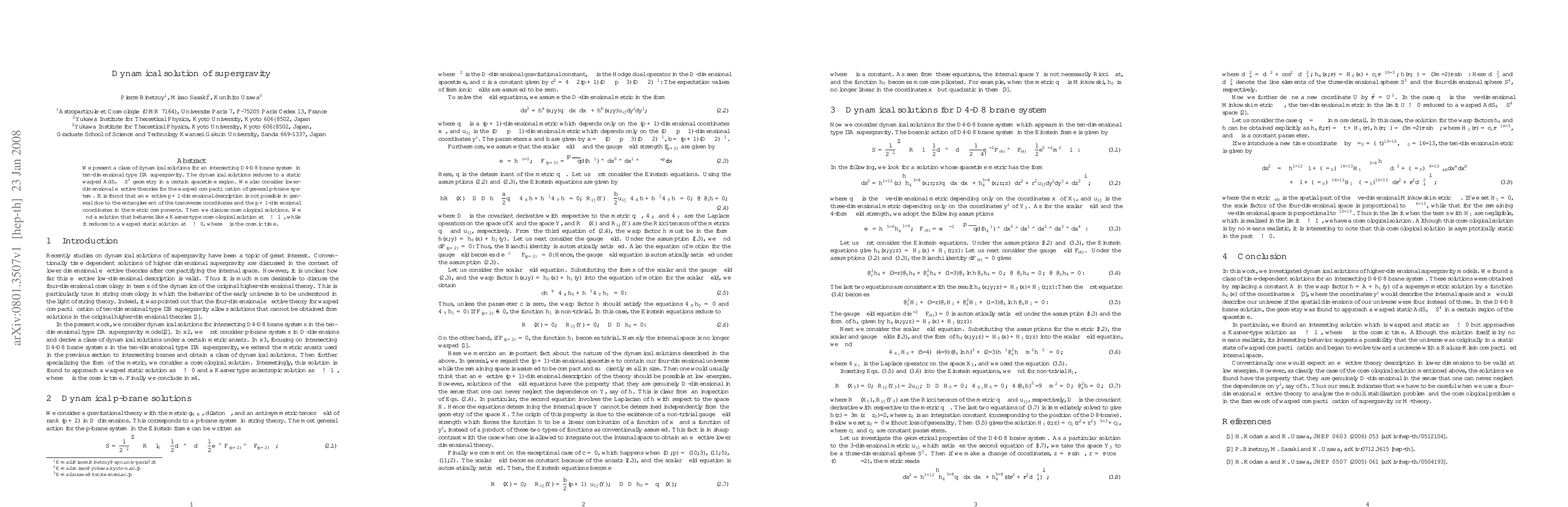 We present a class of dynamical solutions for an intersecting D4-D8 brane system in ten-dimensional type IIA supergravity. The dynamical solutions reduces to a static warped AdS_6 x S^4 geometry in a certain spacetime region. We also consider lower-dimensional effective theories for the warped compactification of general p-brane system. It is found that an effective (p+1)-dimensional description is not possible in general due to the entanglement of the transverse coordinates and the (p+1)-dimensional coordinates in the metric components. Then we discuss cosmological solutions. We find a solution that behaves like a Kasner-type cosmological solution at $\tau\to\infty$, while it reduces to a warped static solution at $\tau\to0$, where $\tau$ is the cosmic time.
