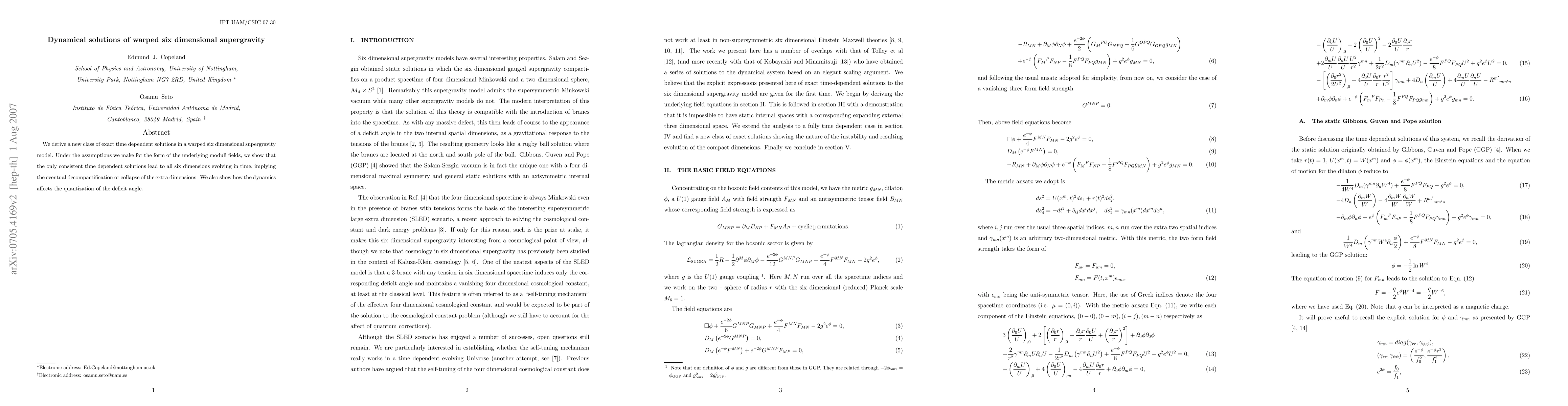 We derive a new class of exact time dependent solutions in a warped six dimensional supergravity model. Under the assumptions we make for the form of the underlying moduli fields, we show that the only consistent time dependent solutions lead to all six dimensions evolving in time, implying the eventual decompactification or collapse of the extra dimensions. We also show how the dynamics affects the quantization of the deficit angle.