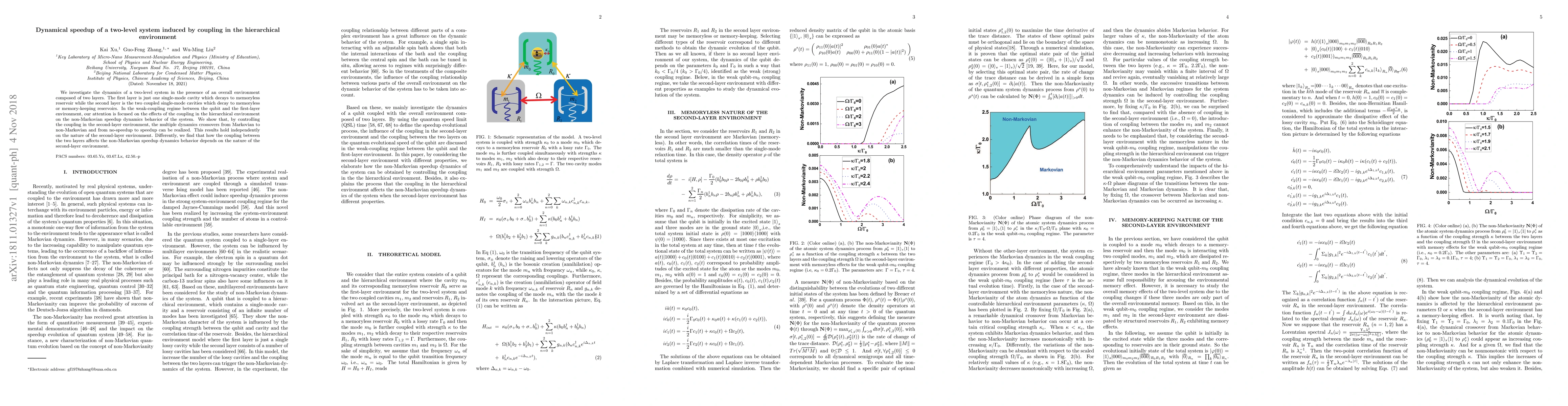 We investigate the dynamics of a two-level system in the presence of an overall environment composed of two layers. The first layer is just one single-mode cavity which decays to memoryless reservoir while the second layer is the two coupled single-mode cavities which decay to memoryless or memory-keeping reservoirs. In the weak-coupling regime between the qubit and the first-layer environment, our attention is focused on the effects of the coupling in the hierarchical environment on the non-Markovian speedup dynamics behavior of the system. We show that, by controlling the coupling in the second-layer environment, the multiple dynamics crossovers from Markovian to non-Markovian and from no-speedup to speedup can be realized. This results hold independently on the nature of the second-layer environment. Differently, we find that how the coupling between the two layers affects the non-Markovian speedup dynamics behavior depends on the nature of the second-layer environment.