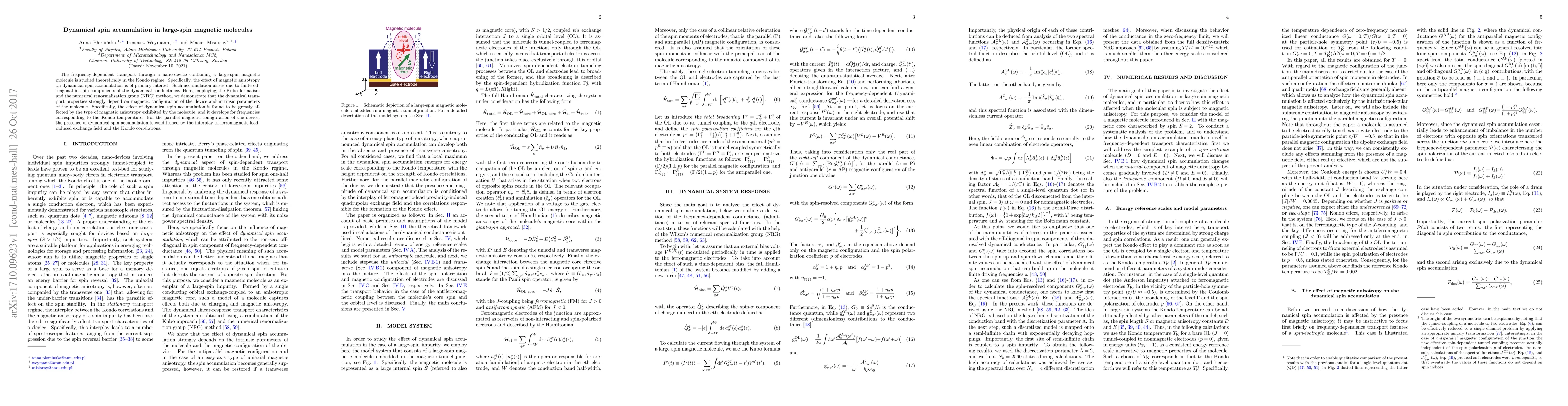 The frequency-dependent transport through a nano-device containing a large-spin magnetic molecule is studied theoretically in the Kondo regime. Specifically, the effect of magnetic anisotropy on dynamical spin accumulation is of primary interest. Such accumulation arises due to finite off-diagonal in spin components of the dynamical conductance. Here, employing the Kubo formalism and the numerical renormalization group (NRG) method, we demonstrate that the dynamical transport properties strongly depend on magnetic configuration of the device and intrinsic parameters of the molecule. Specifically, the effect of dynamical spin accumulation is found to be greatly affected by the type of magnetic anisotropy exhibited by the molecule, and it develops for frequencies corresponding to the Kondo temperature. For the parallel magnetic configuration of the device, the presence of dynamical spin accumulation is conditioned by the interplay of ferromagnetic-lead-induced exchange field and the Kondo correlations.