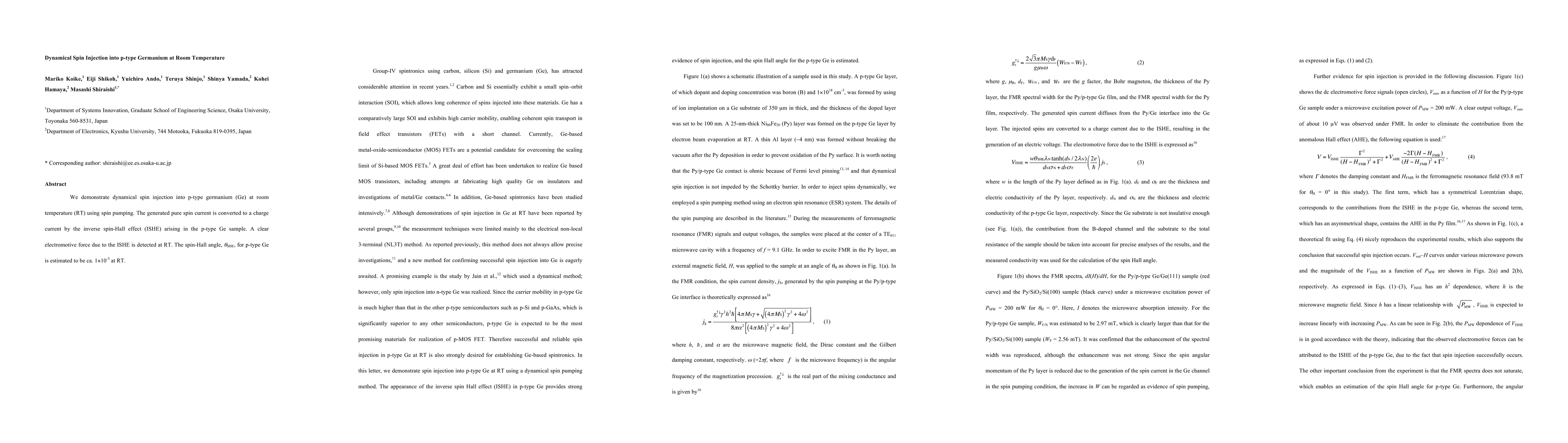 Summary: This paper demonstrates the successful injection of spin current into p-type germanium at room temperature via spin pumping, converting it to a charge current through the inverse spin-Hall effect. The study estimates the spin-Hall angle for p-type Ge at 2.6x10^-3, significantly higher than that of p-type silicon.