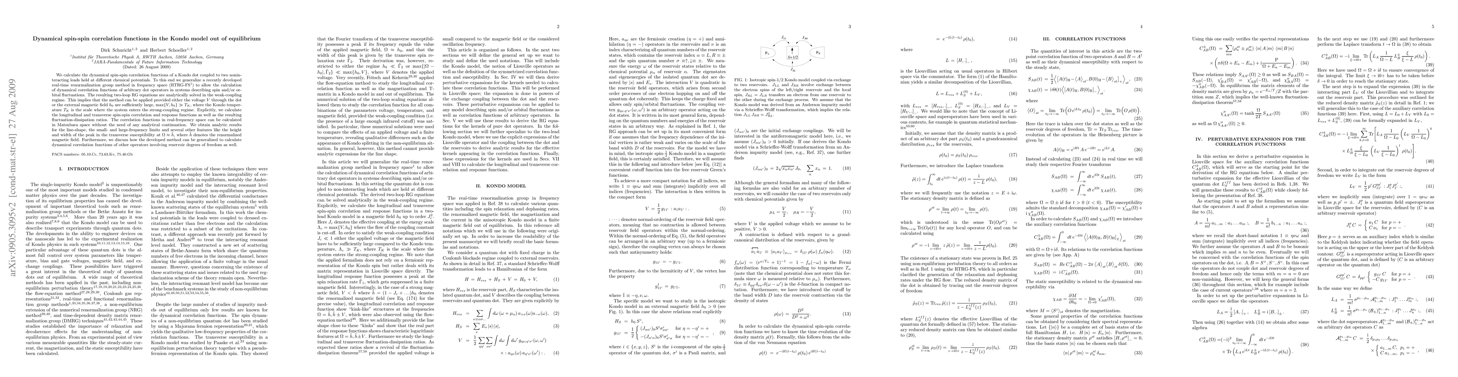 This paper generalizes a real-time renormalization group method to calculate dynamical spin-spin correlation functions in a Kondo dot out of equilibrium, solving the two-loop RG equations analytically in the weak-coupling regime. The method provides insights into longitudinal and transverse spin-spin correlation and response functions, and their fluctuation-dissipation ratios, with analytic results for various features including peak height and width in transverse susceptibility.