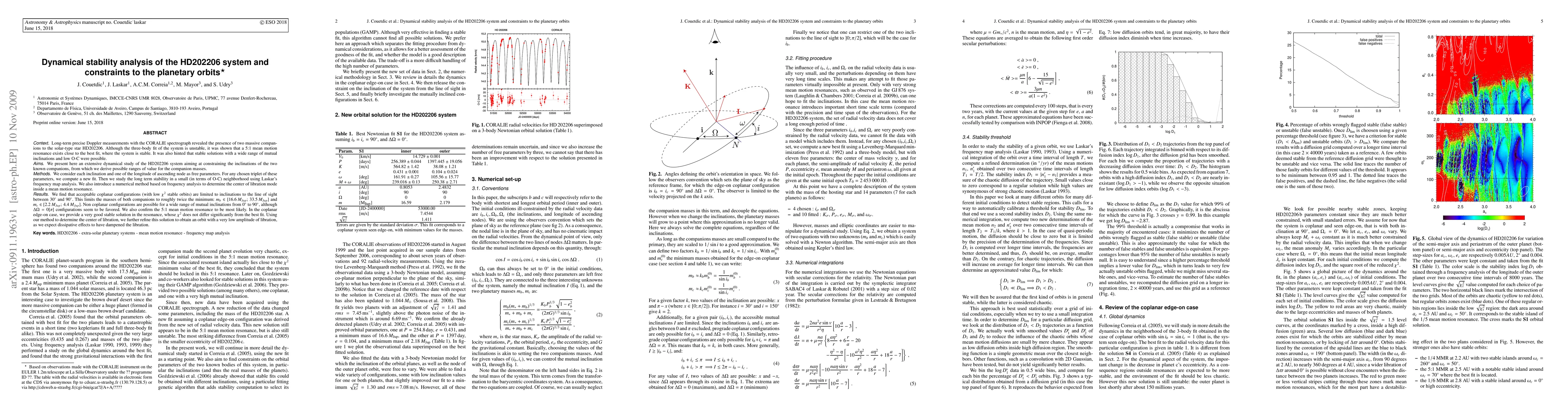 Long-term precise Doppler measurements with the CORALIE spectrograph revealed the presence of two massive companions to the solar-type star HD202206. Although the three-body fit of the system is unstable, it was shown that a 5:1 mean motion resonance exists close to the best fit, where the system is stable. We present here an extensive dynamical study of the HD202206 system aiming at constraining the inclinations of the two known companions, from which we derive possible ranges of value for the companion masses. We study the long term stability of the system in a small neighborhood of the best fit using Laskar's frequency map analysis. We also introduce a numerical method based on frequency analysis to determine the center of libration mode inside a mean motion resonance. We find that acceptable coplanar configurations are limited to inclinations to the line of sight between 30 and 90 degrees. This limits the masses of both companions to roughly twice the minimum. Non coplanar configurations are possible for a wide range of mutual inclinations from 0 to 90 degrees, although $\Delta\Omega = 0 [\pi]$ configurations seem to be favored. We also confirm the 5:1 mean motion resonance to be most likely. In the coplanar edge-on case, we provide a very good stable solution in the resonance, whose $\chi^2$ does not differ significantly from the best fit. Using our method to determine the center of libration, we further refine this solution to obtain an orbit with a very low amplitude of libration, as we expect dissipative effects to have dampened the libration.