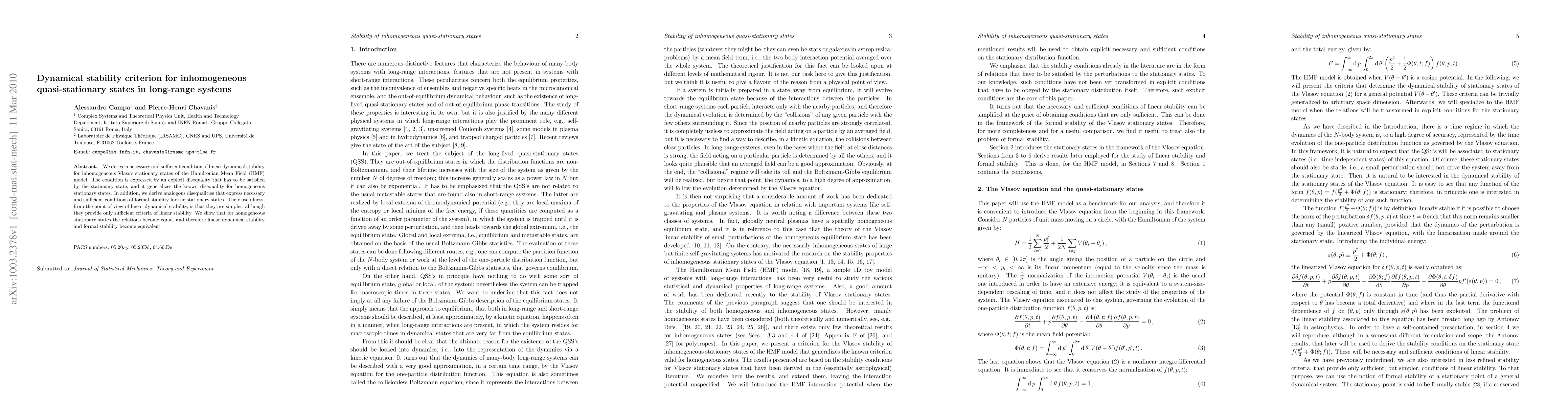This paper establishes a necessary and sufficient condition for linear dynamical stability of inhomogeneous Vlasov stationary states in the Hamiltonian Mean Field model, expressed as an explicit disequality. It also provides simpler, though sufficient, criteria for formal stability, and shows that for homogeneous states, linear and formal stability are equivalent.